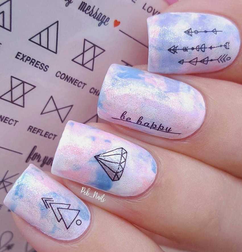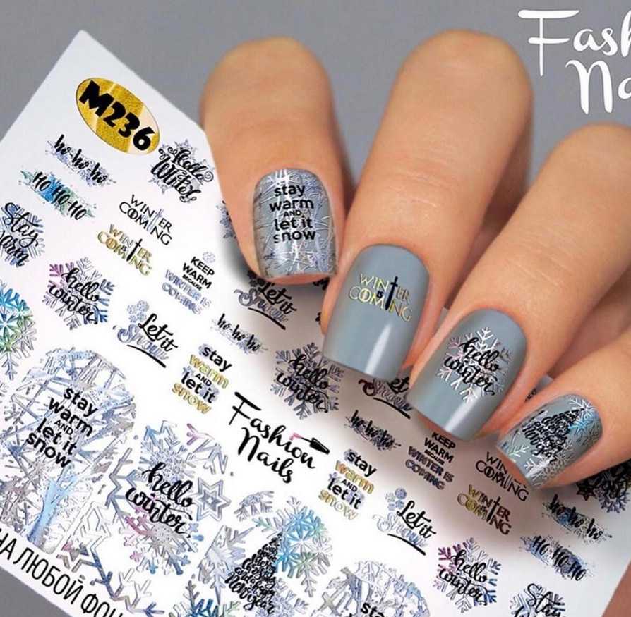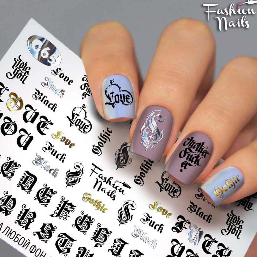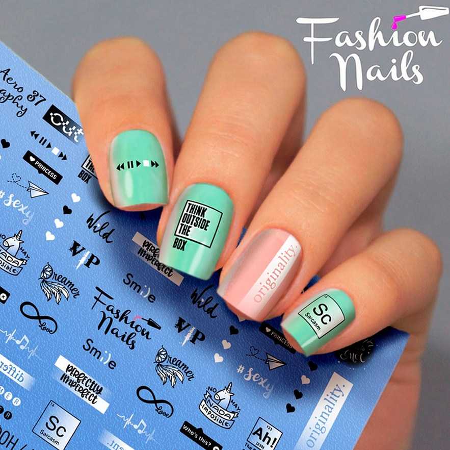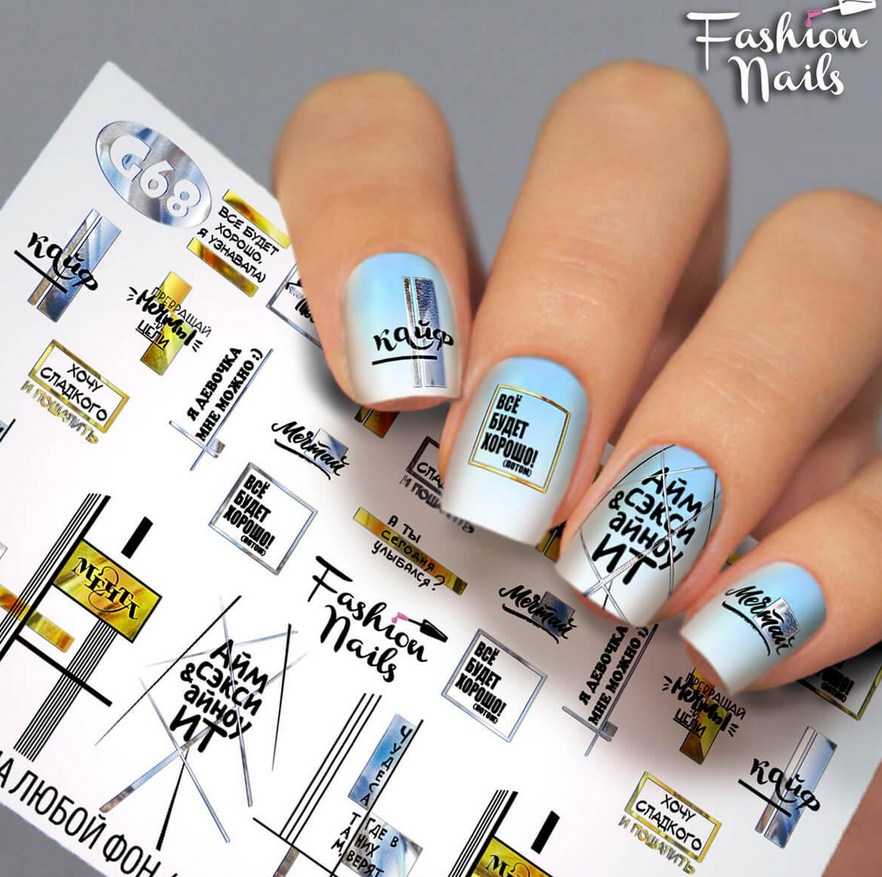 Порой сложно определиться, какие слайдеры с надписями подобрать. Ассортимент наклеек действительно очень велик, причём они стоят недорого, а готовый маникюр получается очень стильным. Нужно только немного аккуратности в отделении наклейки от основы и наложении на ноготь, и оформление будет готово за 5 минут.
