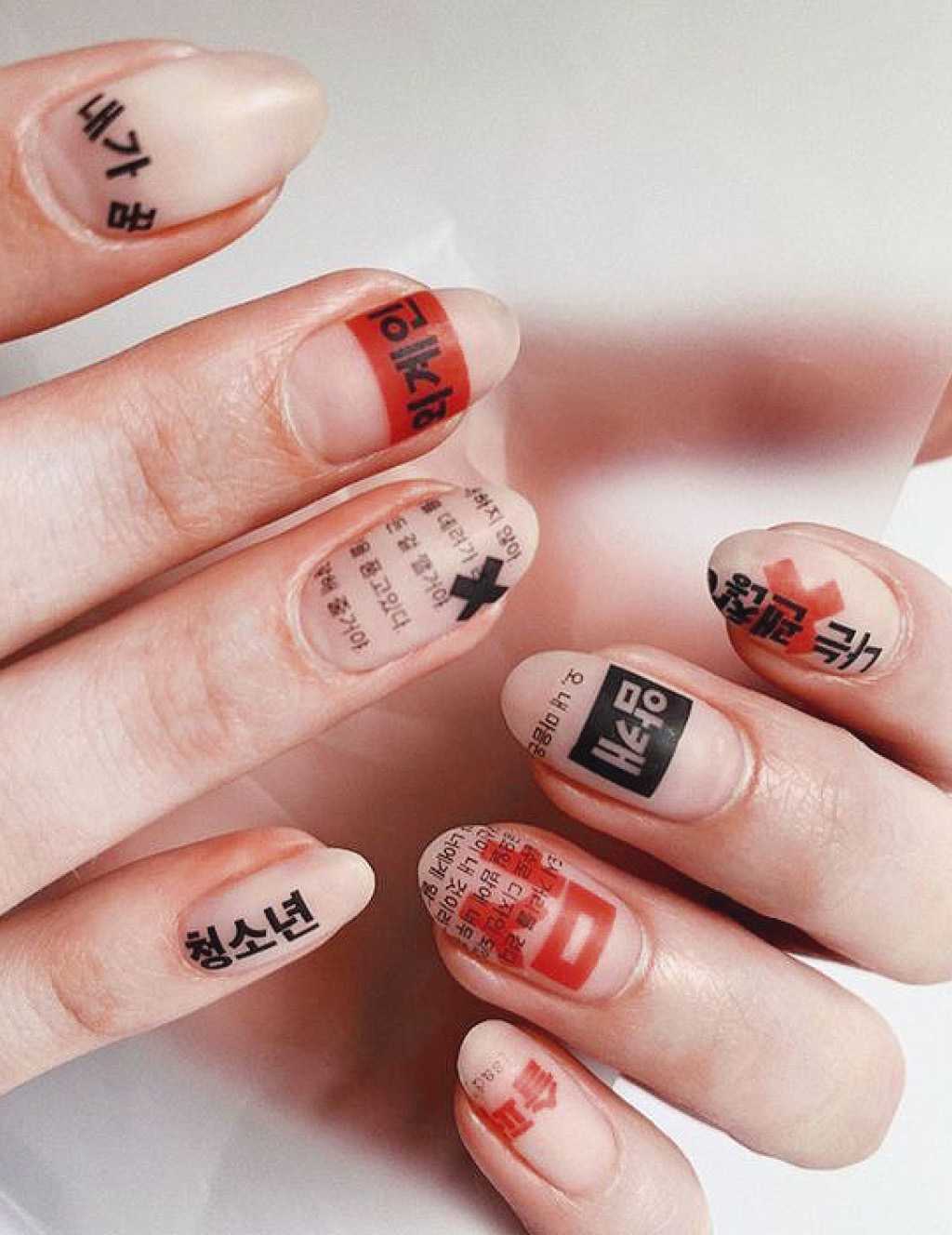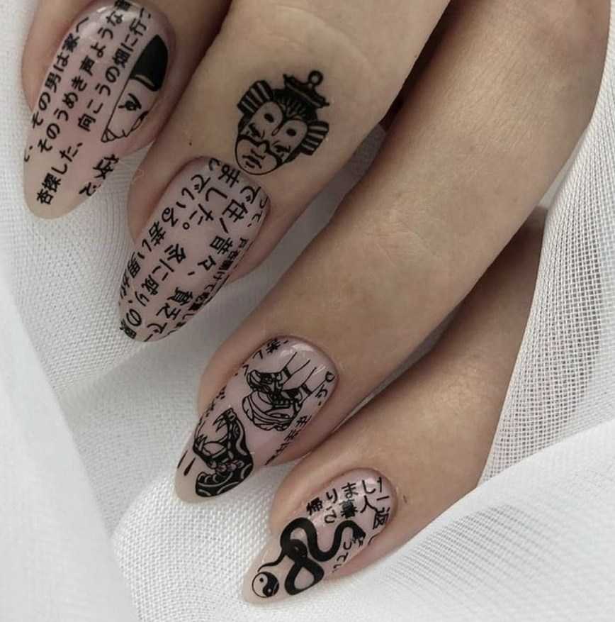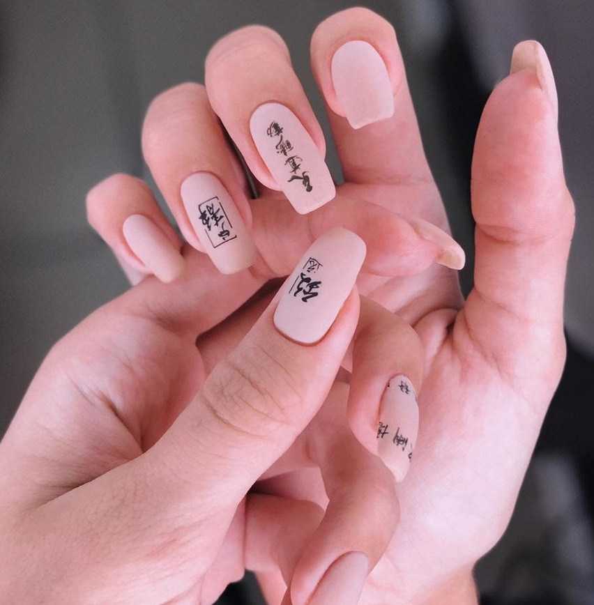 Экзотичности образу добавят китайские иероглифы на нежном нюдовом маникюре.