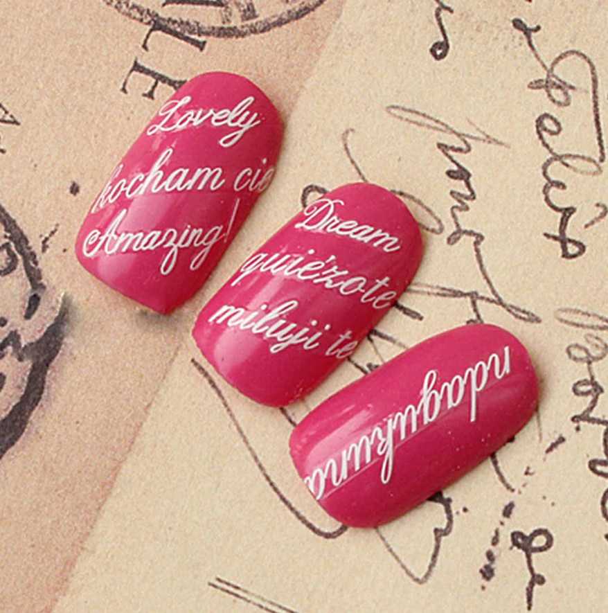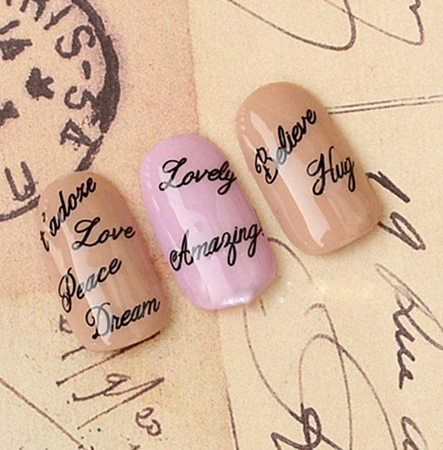 Нарисовать фразы на ногтях не так просто, как может показаться на первый взгляд. Ведь нужно сделать это на маленьком пространстве, при этом соблюдая толщину линии. Поэтому если вы не уверены в своих силах — используйте наклейку. На сегодняшний день в nail-магазинах огромный выбор различных надписей, слов и букв. Чтобы закрепить наклейку, воспользуйтесь следующей инструкцией: