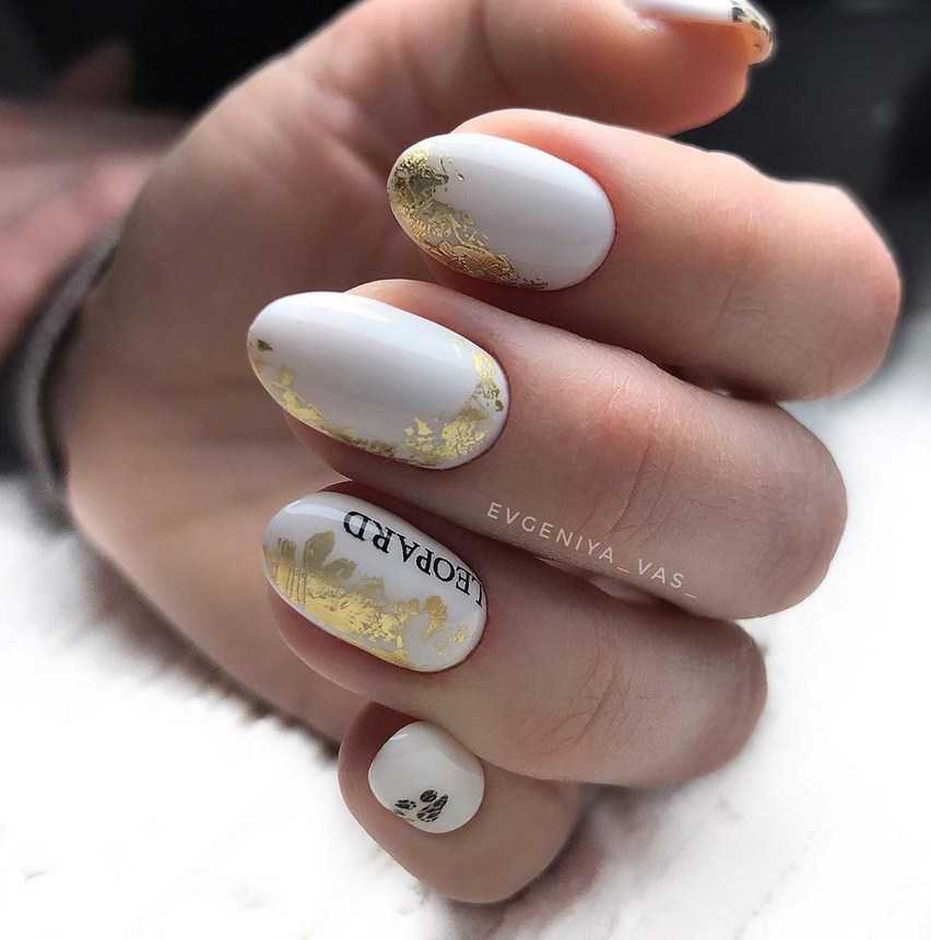 Фольга широко используется мастерами нейл-арта для самостоятельного маникюра, но не менее часто она становится красивым дополнительным элементом для основного дизайна. При наличии сноровки можно обрамить фольгой буквы или выложить их непосредственно из неё. Более лёгкая в исполнении идея – добавление на ноготок кусочков фольги или потали в хаотичном порядке.