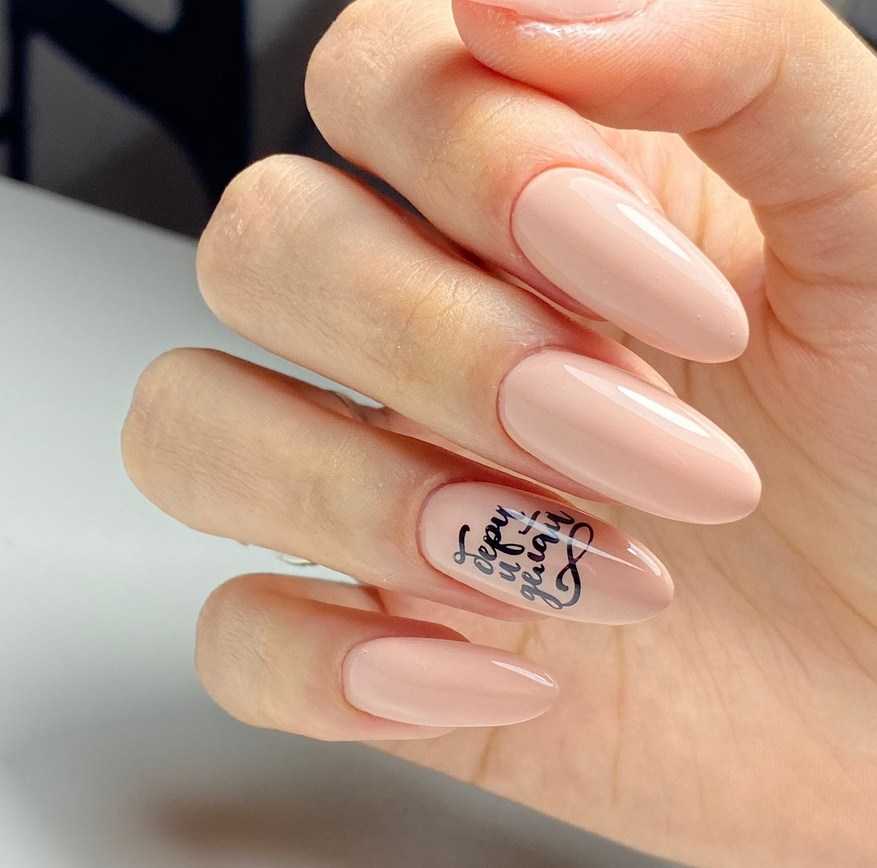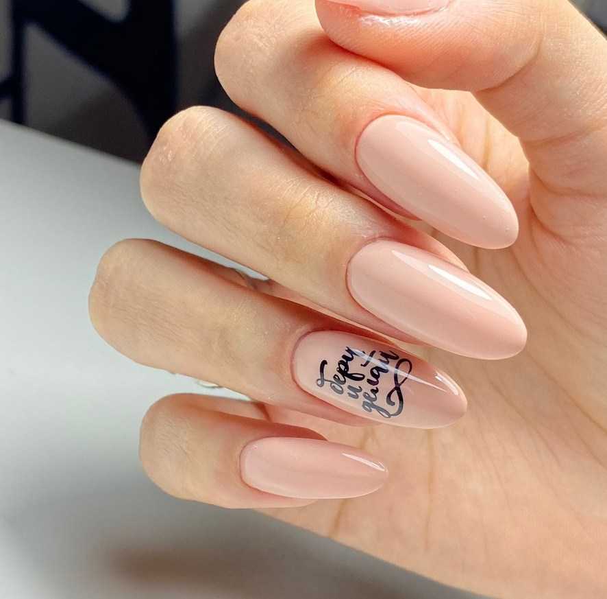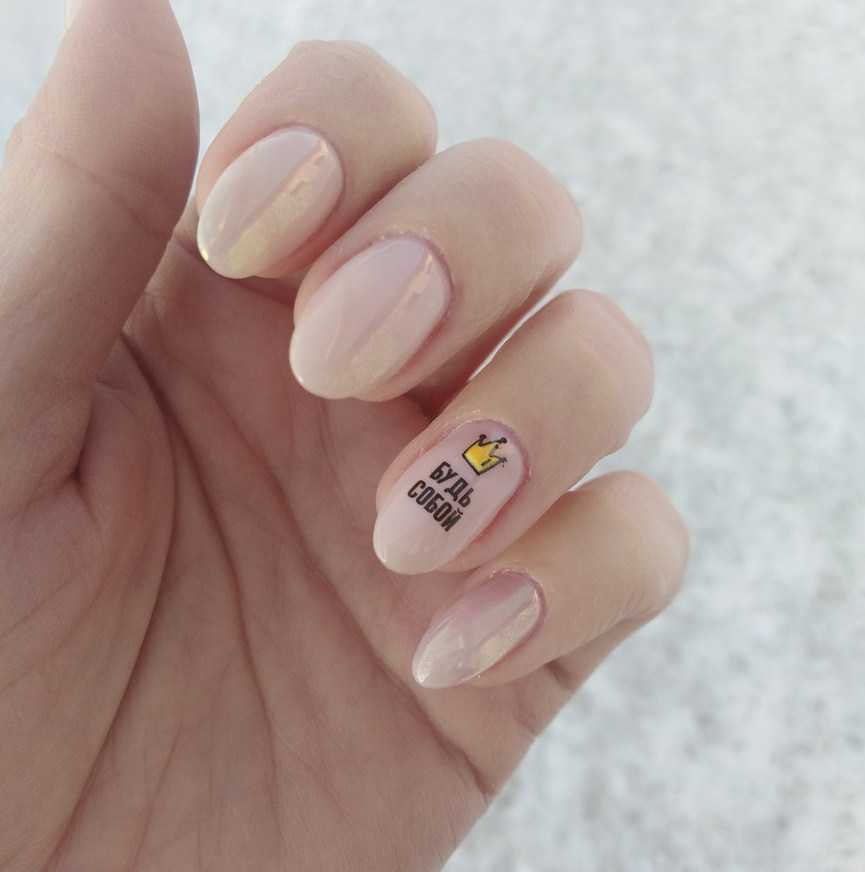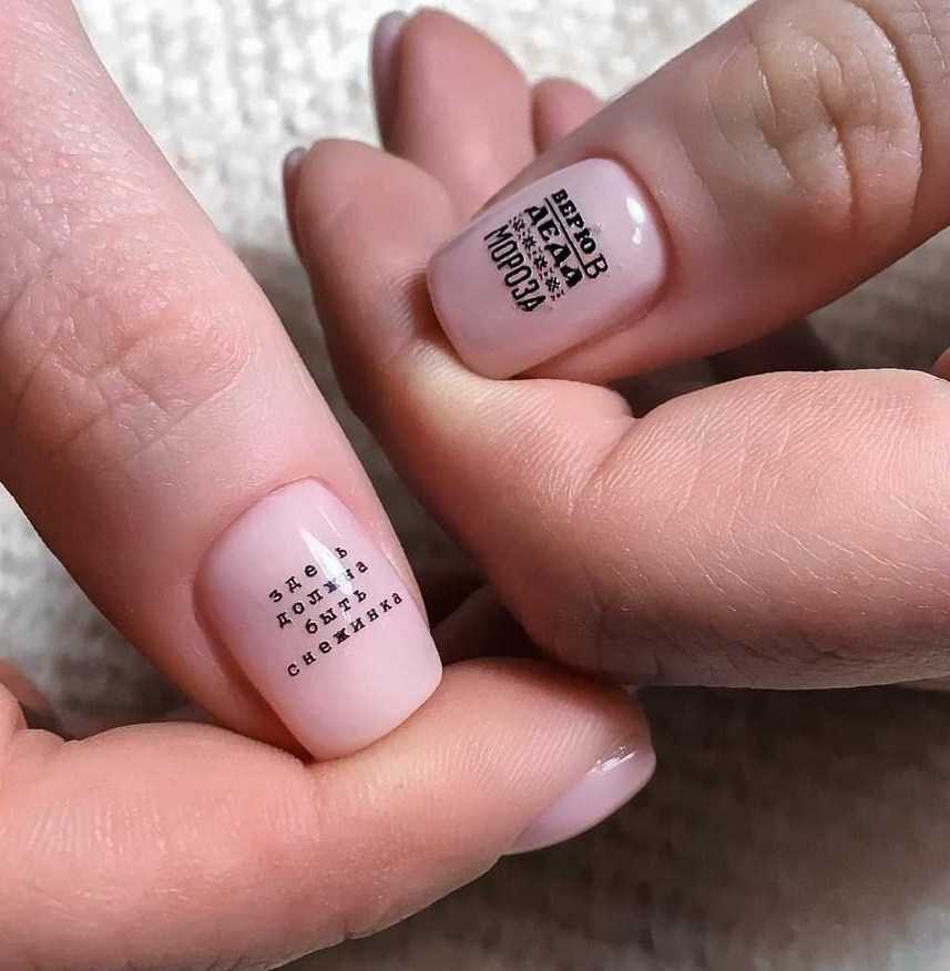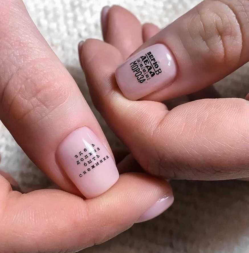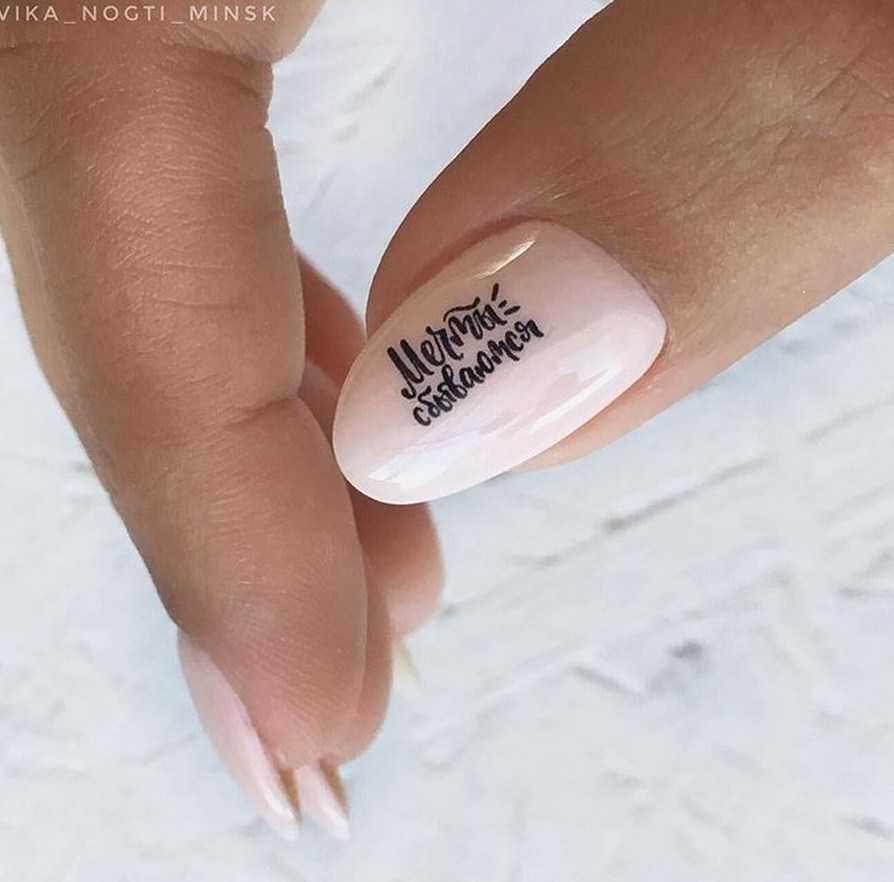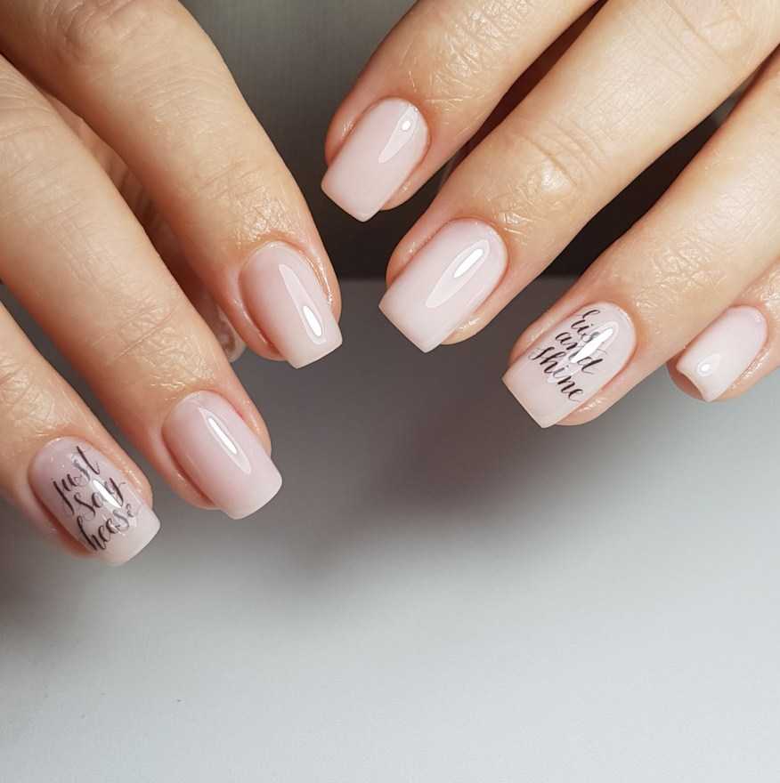 Спокойные, классические тона в нейл-арте – самая подходящая база для выполнения надписей. Рисунок такого типа разбавит скромность, лаконичность маникюра, но без лишней вычурности. Классные варианты – газетный дизайн, слова и фразы тёмным лаком с добавлением пары стразов.