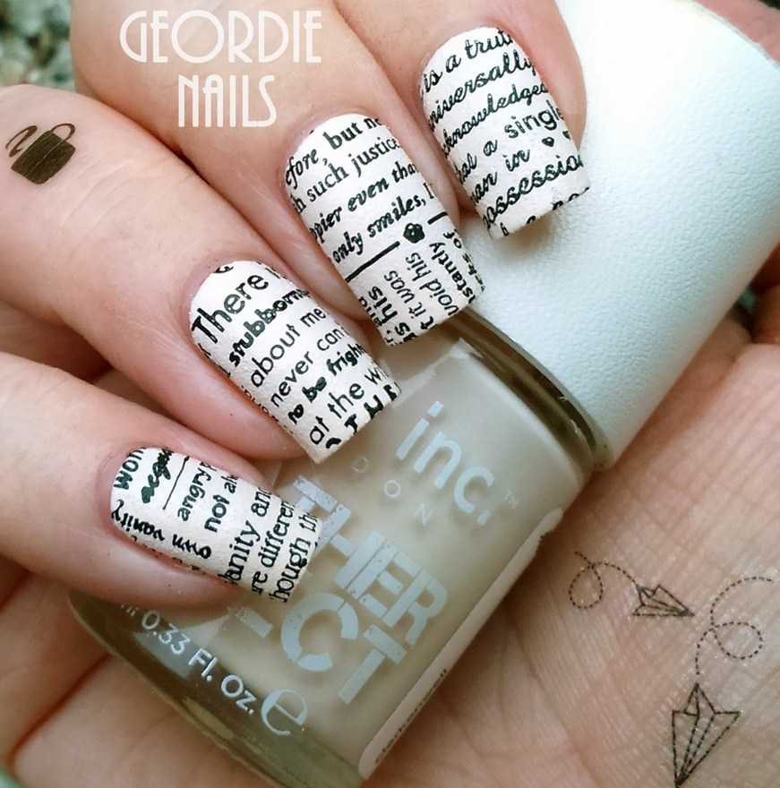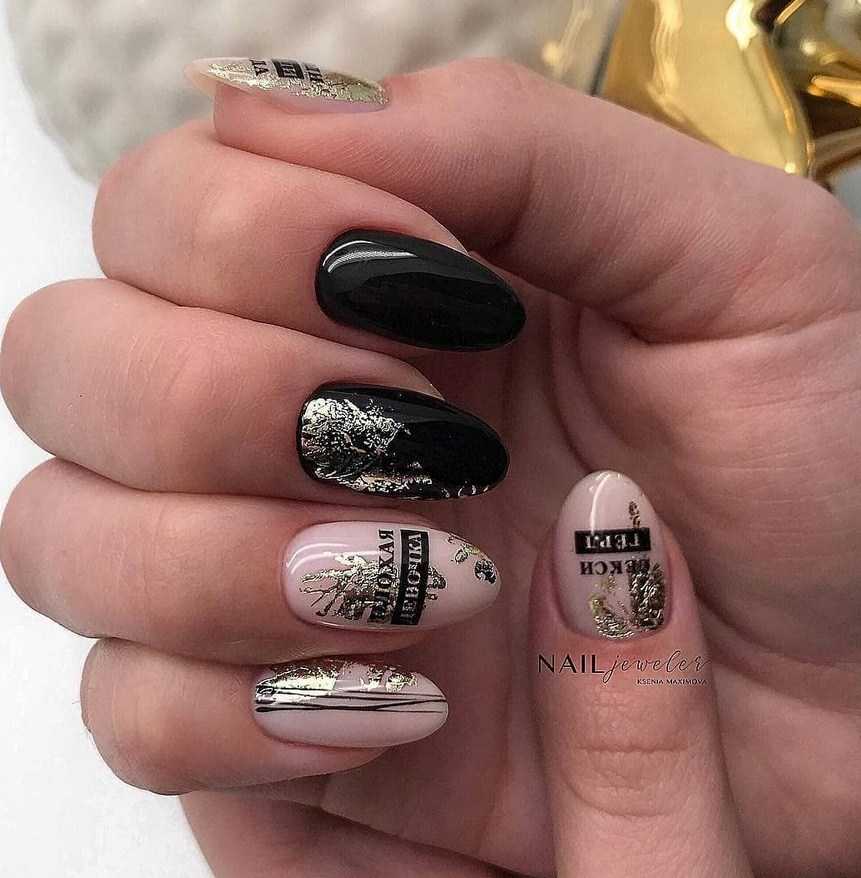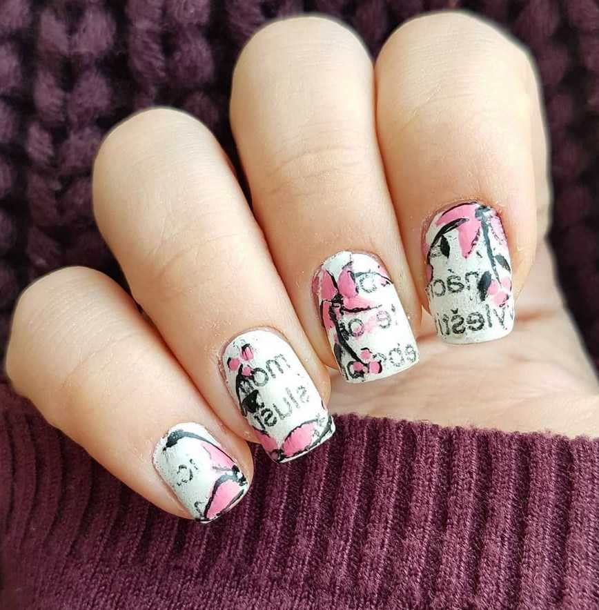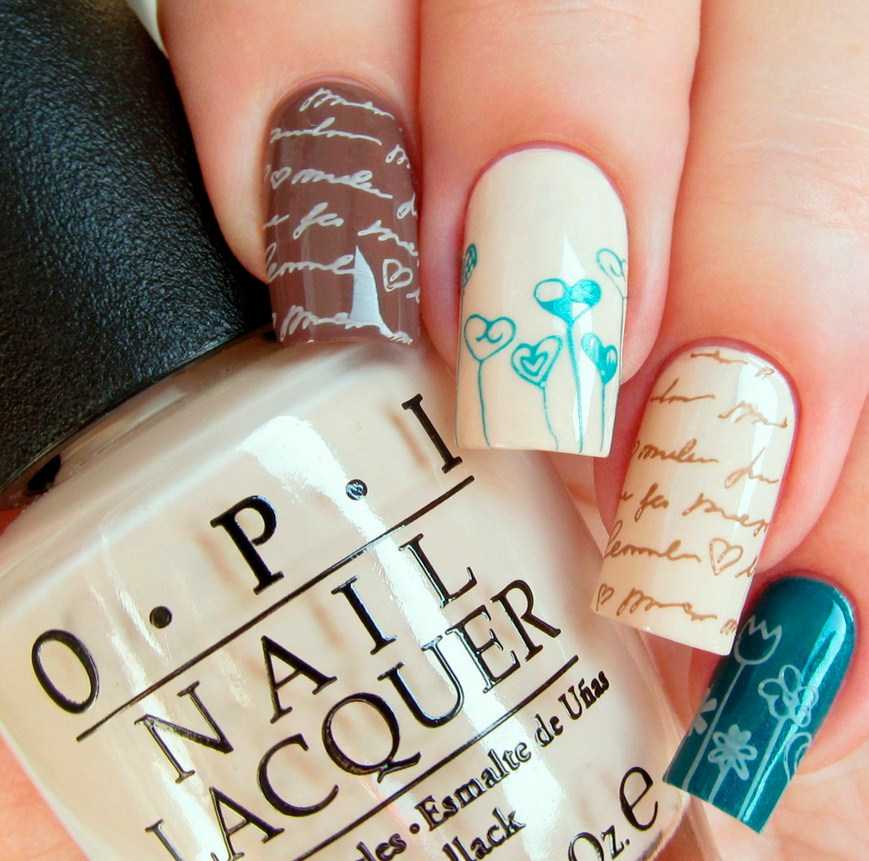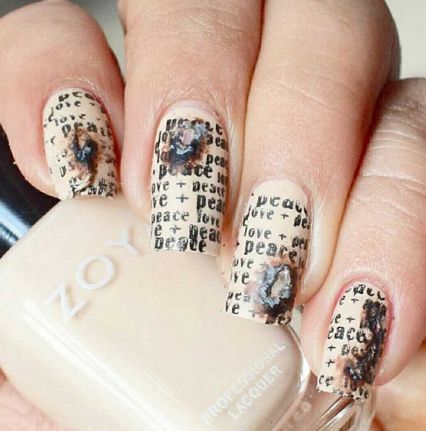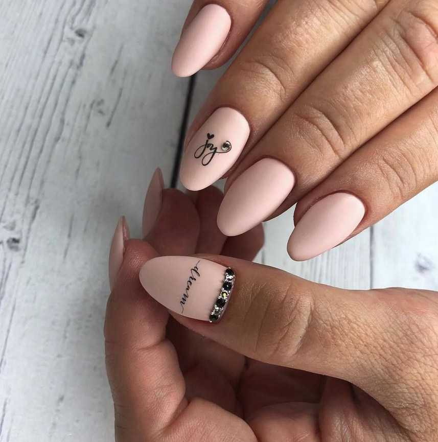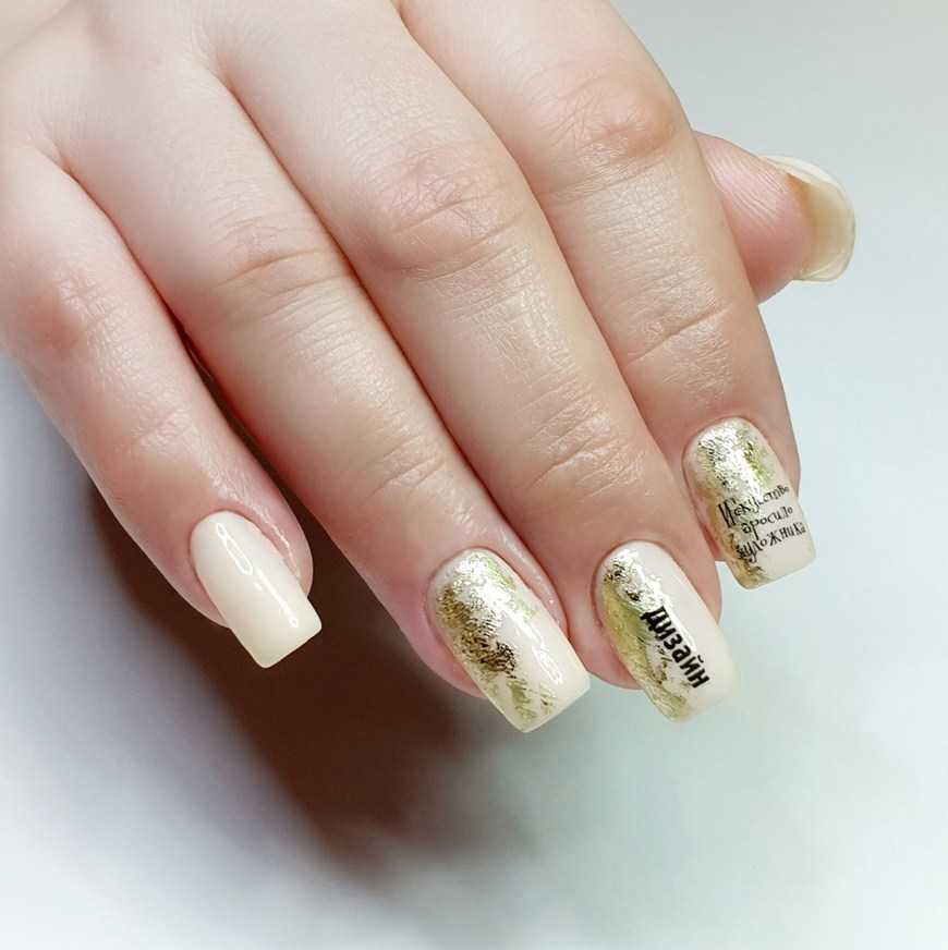 Спокойные, классические тона в нейл-арте – самая подходящая база для выполнения надписей. Рисунок такого типа разбавит скромность, лаконичность маникюра, но без лишней вычурности. Классные варианты – газетный дизайн, слова и фразы тёмным лаком с добавлением пары стразов.