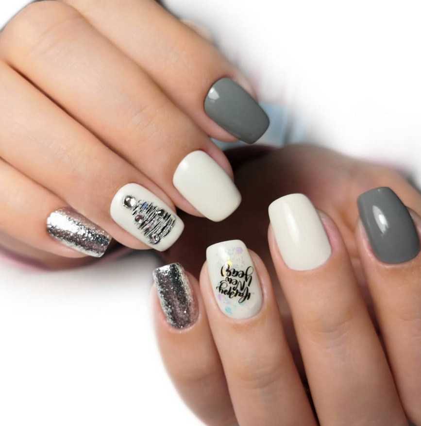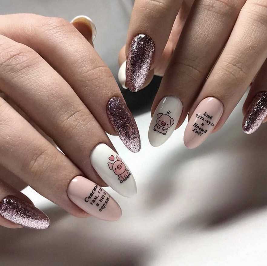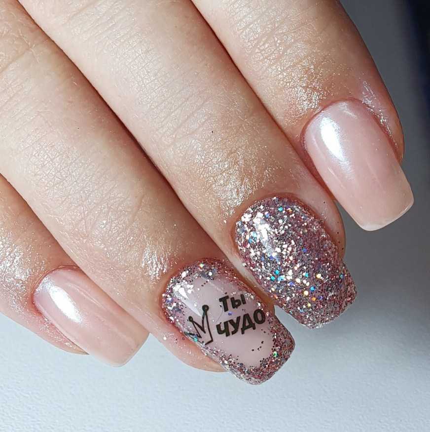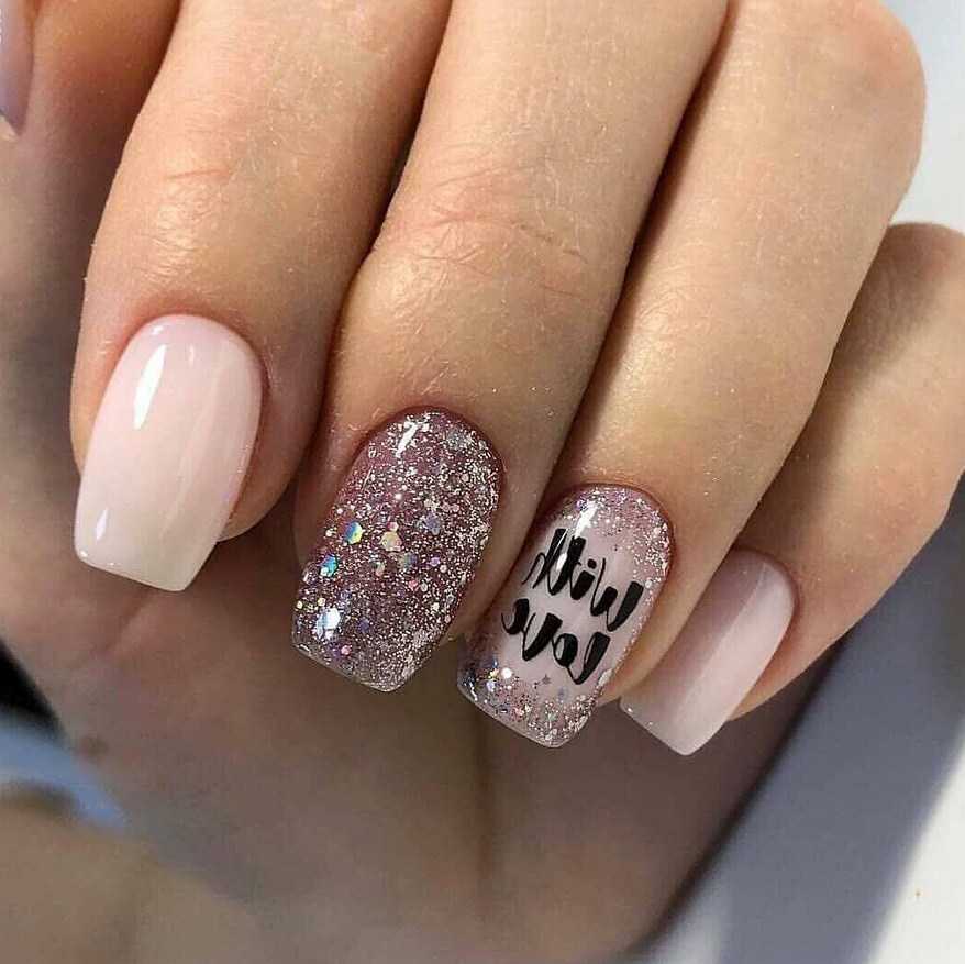 Надписи из глиттера. Простой маникюр, который совмещает в себе нотки аскетичности и гламура. В данном случае помимо белого покрытия можно использовать и цветные лаки в качестве основы. Что до надписей, кроме основных “love”, “Soul”, “ Amour”, “Cool” также можно использовать и фразы на русском языке, например “Принцесса”, “Сладкая” и т.д.
