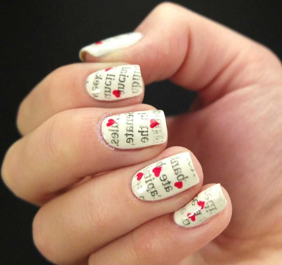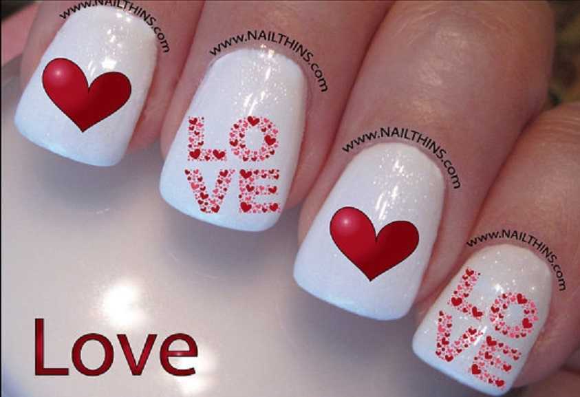 Одним из самых ярких, эффектных и красивых дизайнов для Дня святого Валентина, без сомнения, считается красный маникюр с надписями «любовь» на русском или же на английском языке, по желанию. Вряд ли хотя бы один мужчина сможет остаться равнодушным к таким ноготкам. Отлично подойдет такой маникюр для страстного свидания с любимым человеком. Лучше всего надписи делать более светлым цветом или же контрастным. Например, на красном фоне отлично будет смотреться розовый, белый, нюдовый, пастельный и даже черный.