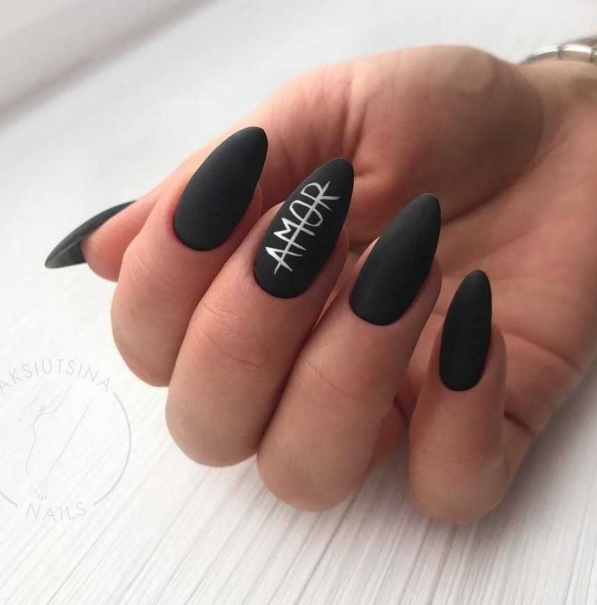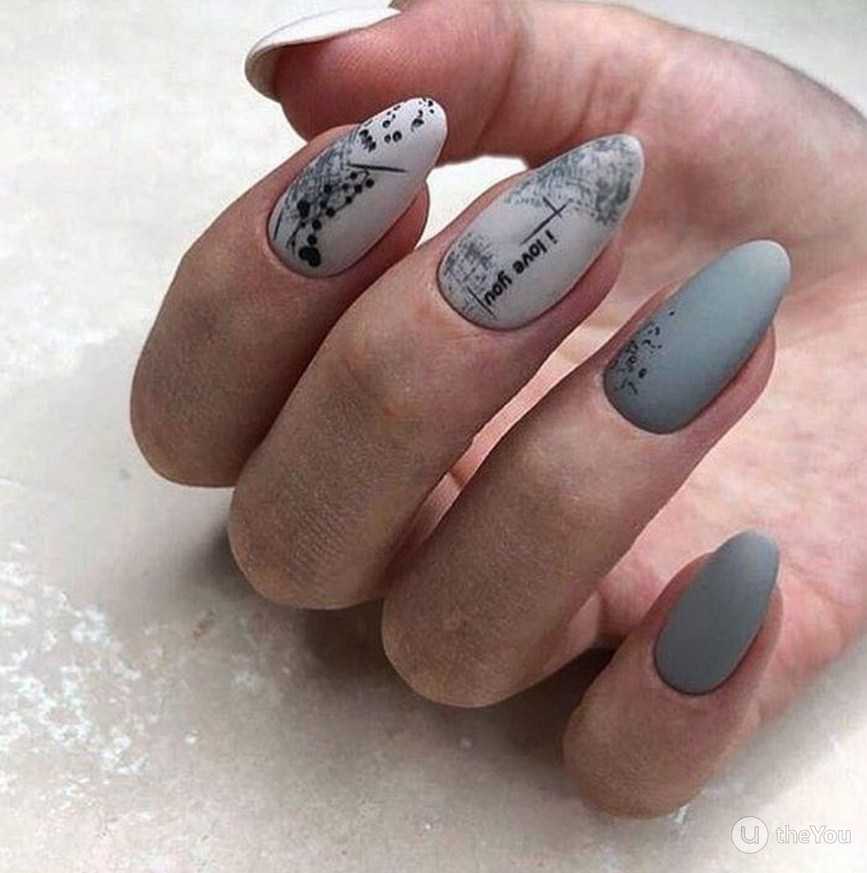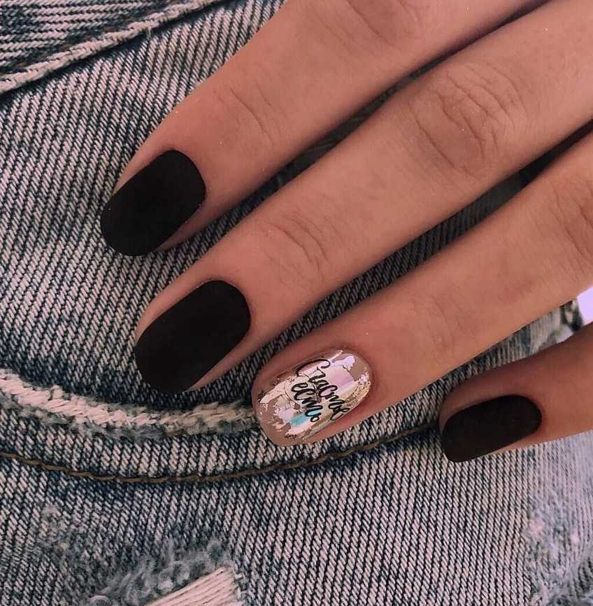 Следующий дизайн, пожалуй, один из самых популярных вариантов оформления ногтей с использованием декора в виде надписей. 2023 год богат на интересные матовые дизайны. Вот один из них.