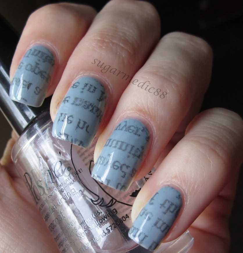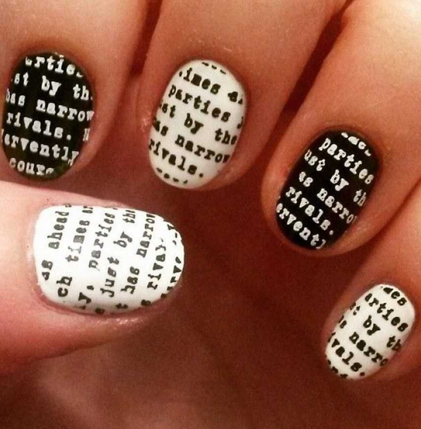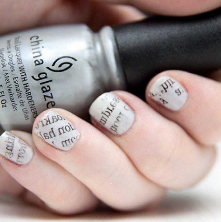 С помощью обычной газеты можно сделать неповторимый маникюр на ноготках. Для его изготовления вырезают из газеты кусочки нужного размера, но чуть больше ногтевой пластины. Наносят базу, цветной лак, дают высохнуть. После окунают кусочек в спирт, через 10 секунд достают и сразу приклеивают на ноготь. Прижимают ватным диском, по мере подсыхания покрывают топом.