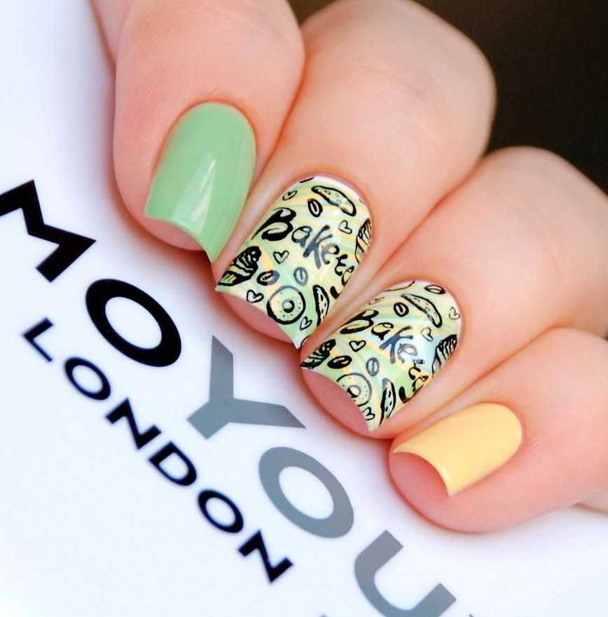 Очень популярен маникюр френч или лунный с добавлением букв, причём он может быть белым или цветным. В летнем сезоне выполнять рисунки можно чёрным, красным, белым цветом, а также любыми яркими лаками.