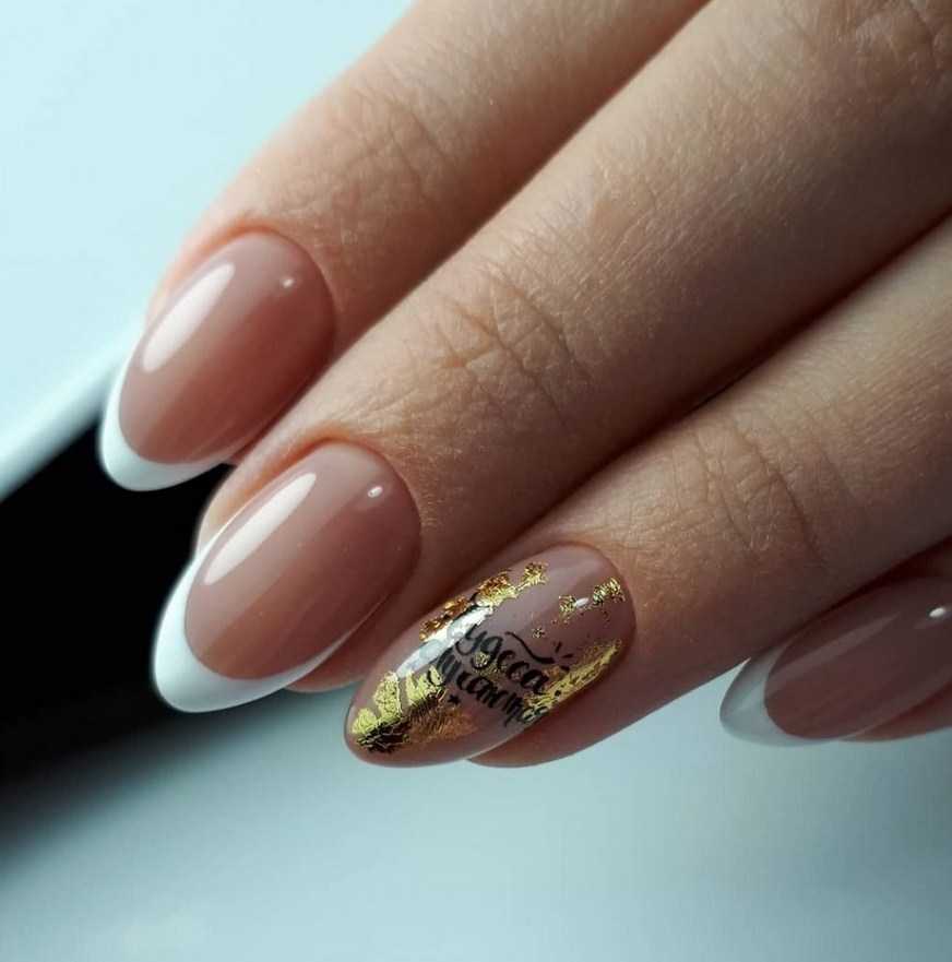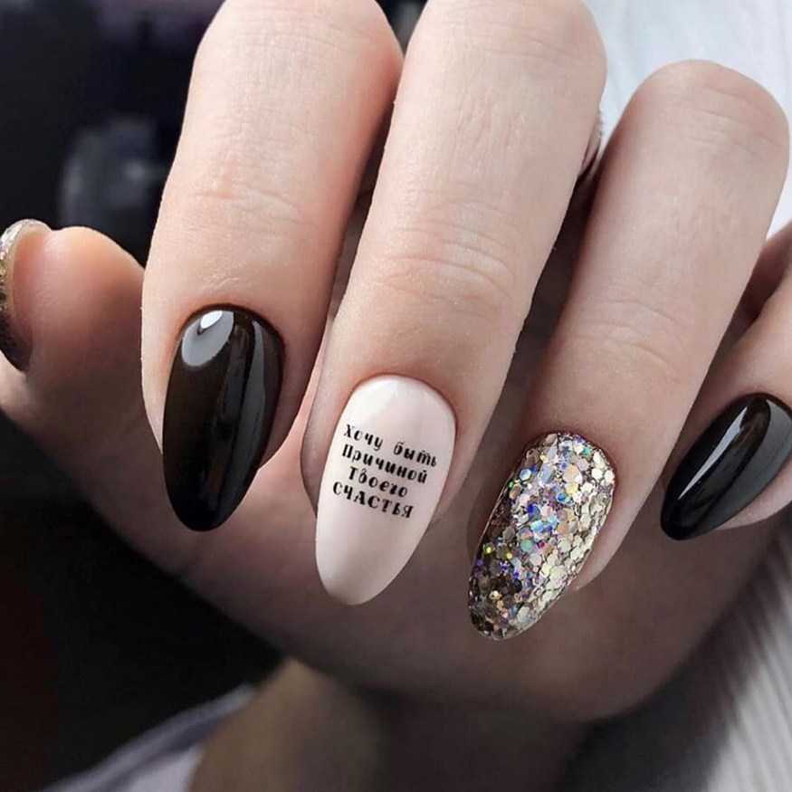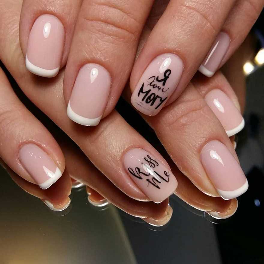 Френч. Если вам надоел классический французский маникюр, и вы хотите его как-то разнообразить, надписи на ногтях как раз в этом и помогут. Стоит лишь выделить один ноготь полностью бежевой основой и нанести поверх одно или несколько слов черным гелем или глиттером. Дополнить такой дизайн можно фольгой, стразами или рисунками.
