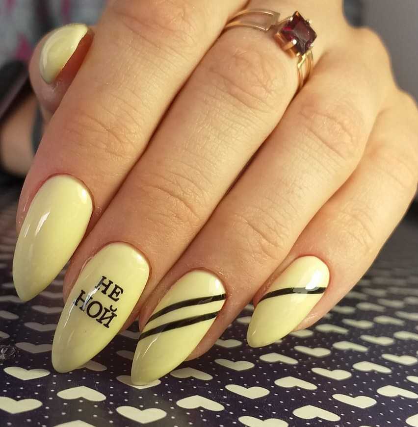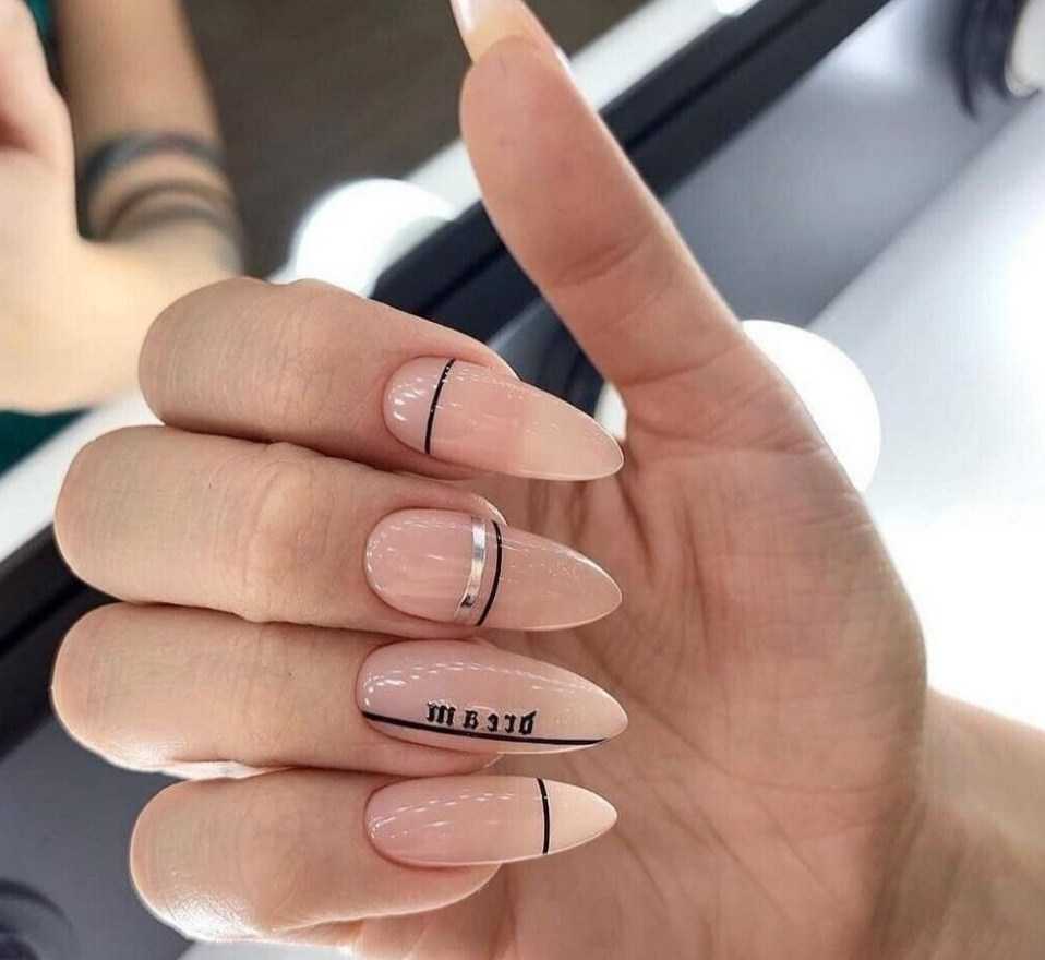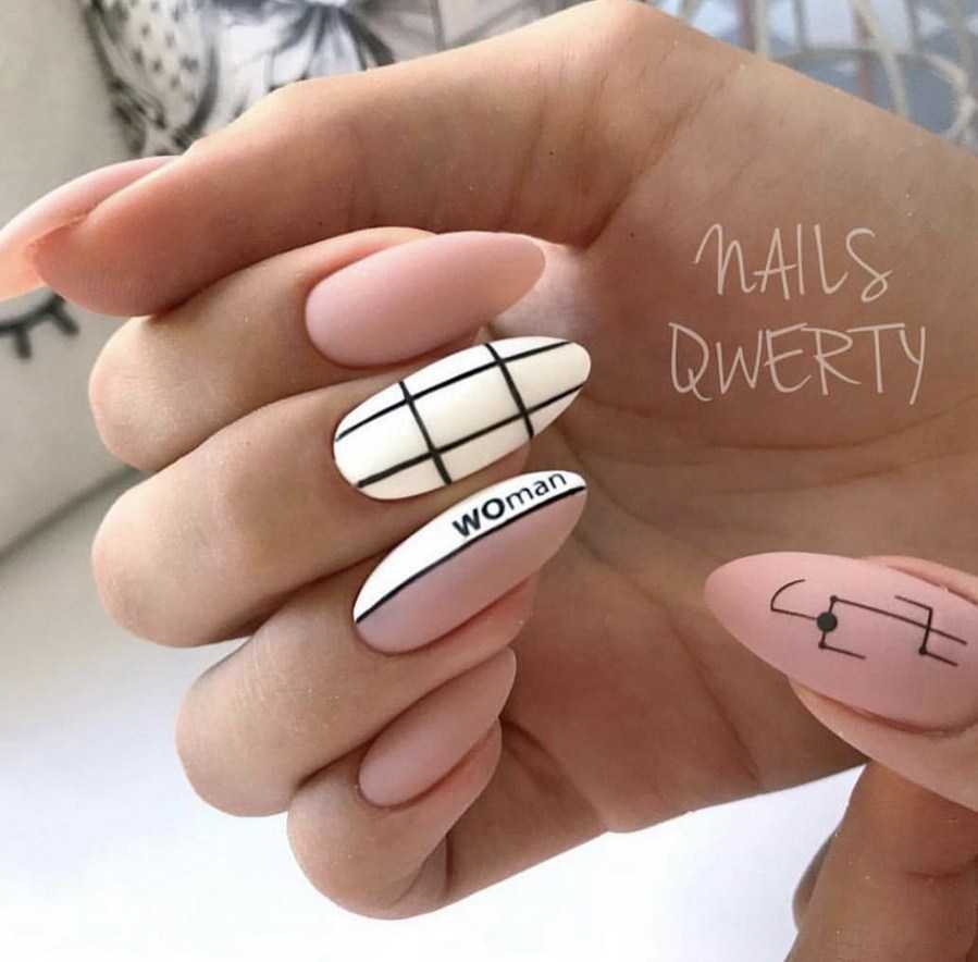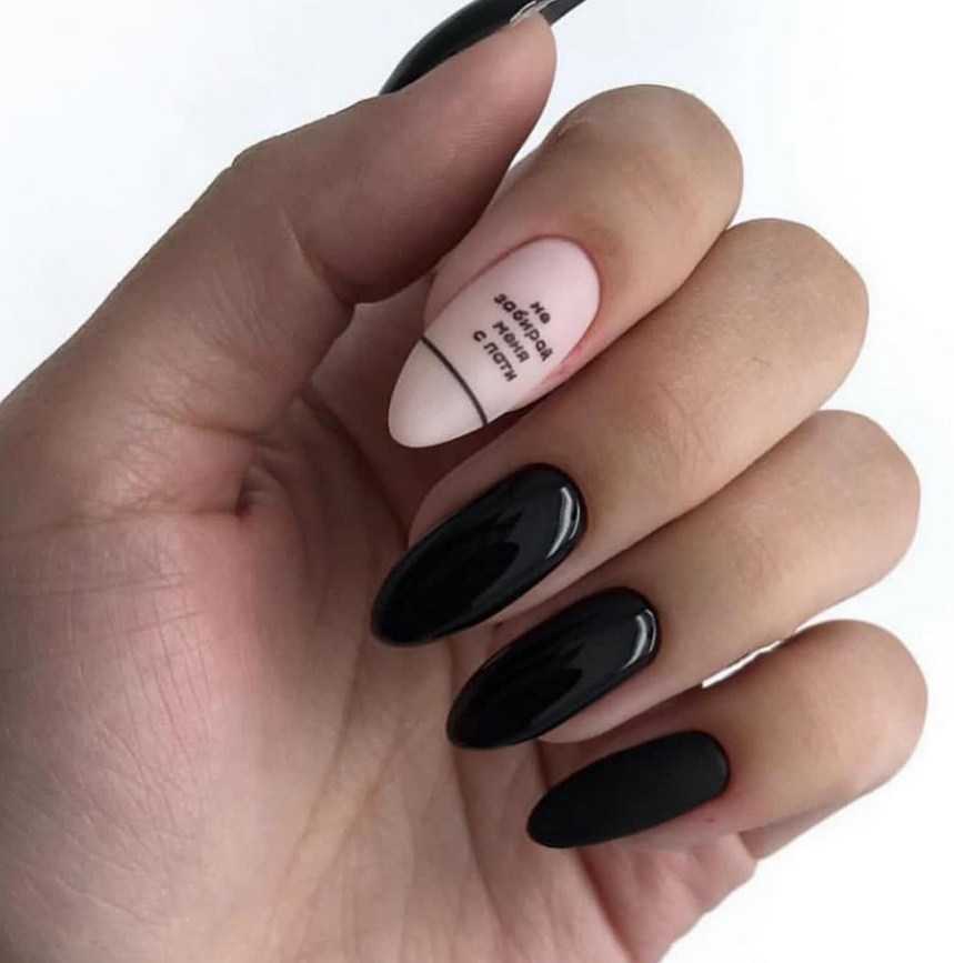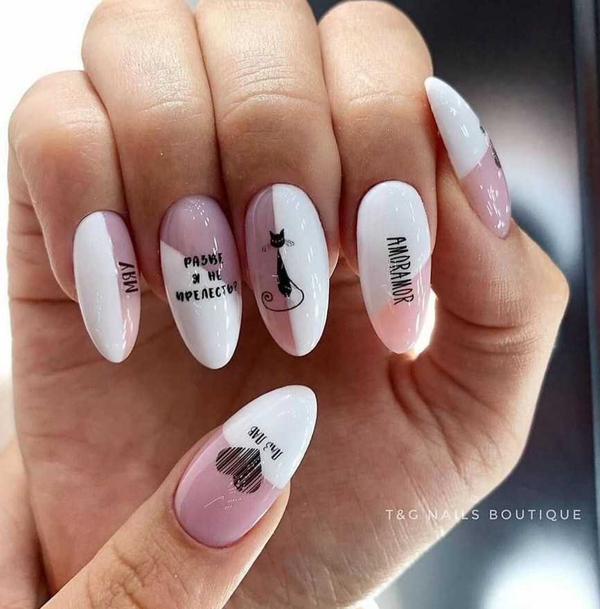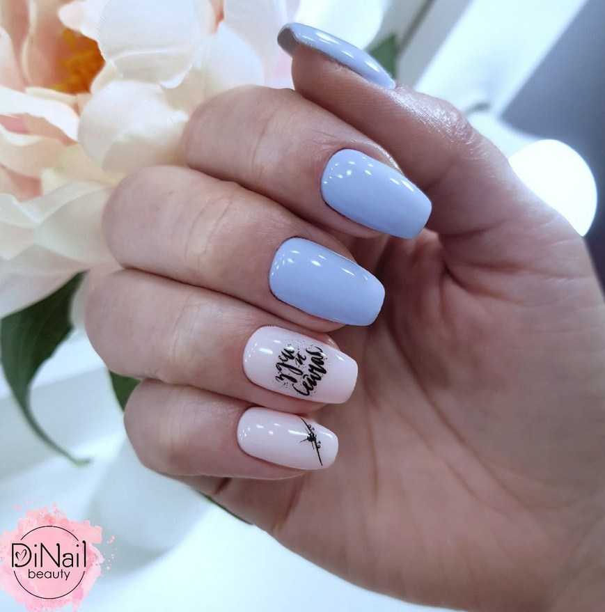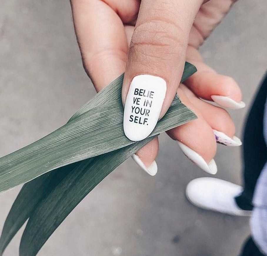 Такие ноготки дают уже довольно большой простор для фантазии. Не стоит делать их аляповатыми, но и скучный нейл-арт тоже не приветствуется. Рекомендуется выбрать фразу с интересным посылом или важные для себя слова, выполнив их контрастным цветом. Надписи в маникюре можно скомбинировать с абстракцией, геометрией, классическим френчем или лунной техникой.