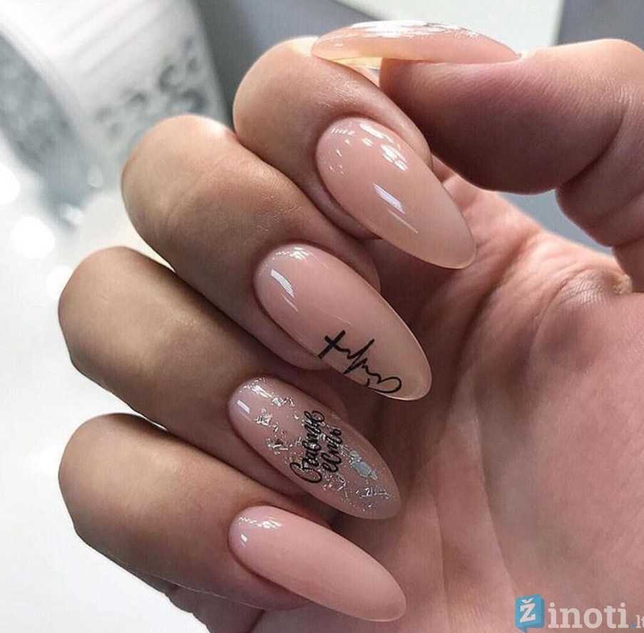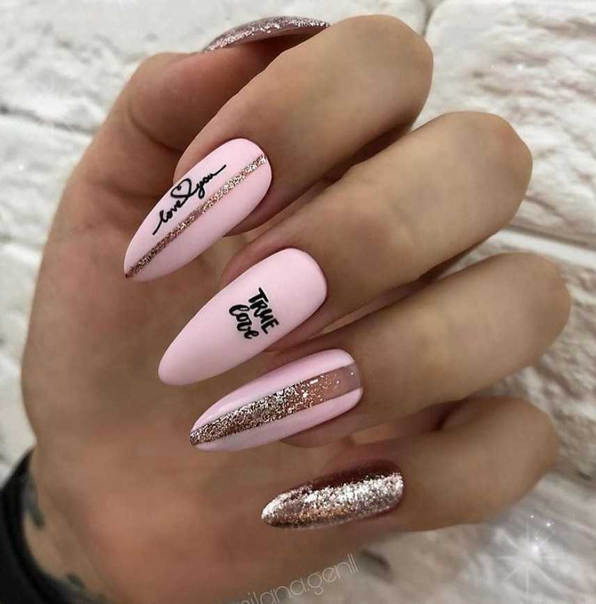 Ноготки-миндаль очень нежные, женственные. Они шикарно комбинируются с романтичными надписями о любви, именами близких людей, с дополнением флористическими рисунками. Прекрасный дуэт такому маникюру на миндале составят блёстки, камни, стразы, втирка.