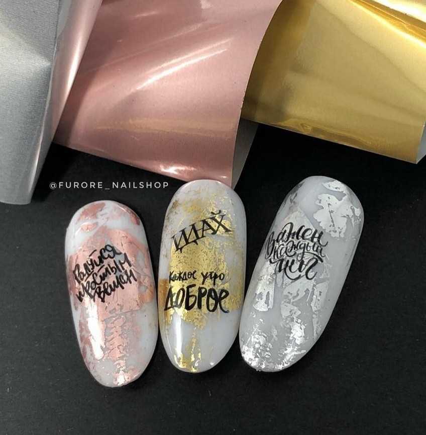 С фольгой. Техника фольгирования в сочетании с надписями на ноготках создают стильный и броский дизайн. В данном случае в качестве надписей идеально подойдут различные лозунги, названия или аббревиатуры брендов, а также имена.