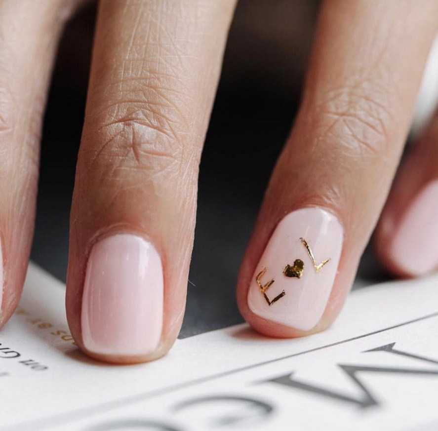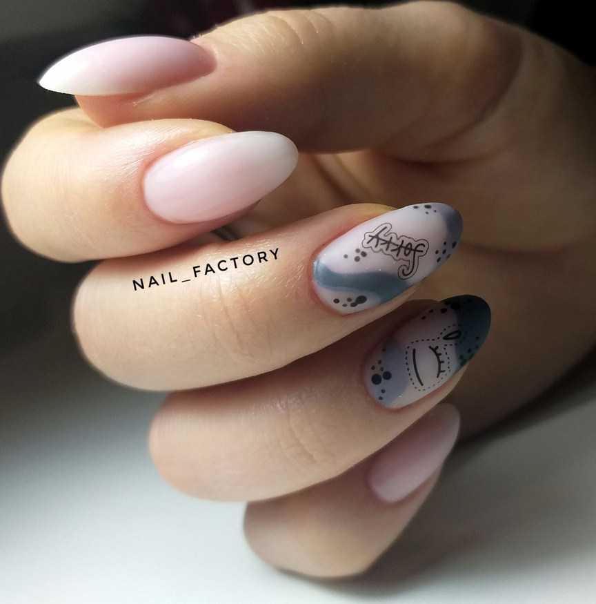 Нежный. Одновременно спокойный и ультрамодный маникюр, который гармонично будет смотреться и на коротких ногтях. В данном случае выделять следует один или два пальца буквами или же небольшими словами прописью. Дополнить такой дизайн помогут хаотично расставленные дотсом точки либо же геометрические элементы в виде прямых линий.