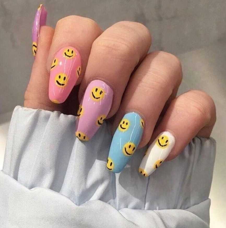 Маникюр со смайликами обычно становится выбором молодых девушек, либо тех, кто идёт на тематическую вечеринку. Весёлые жёлтые рожицы точно поднимут настроение и не позволят заскучать. Яркий дизайн можно сделать без проблем с помощью наклеек, стемпинга, либо нарисовать кистью.