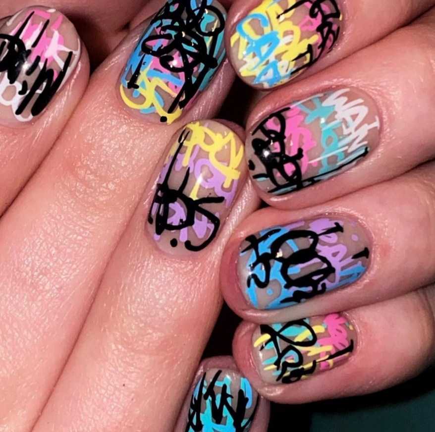 Тренд на граффити в маникюре пришёл из Тик-Тока. Данное художественное направление помогает выразить чувства и ощущения и порой завораживает своей красотой. Опытный мастер нанесёт граффити так, чтобы подчеркнуть индивидуальность и прекрасное чувство стиля женщины.