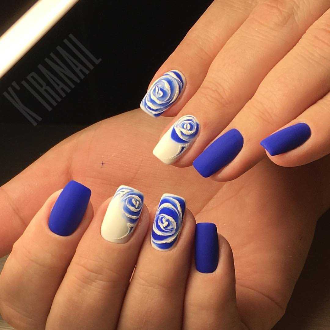 - голубые или синие розы – эти благородные и королевские оттенки великолепно выглядят на ноготках практически всех модниц