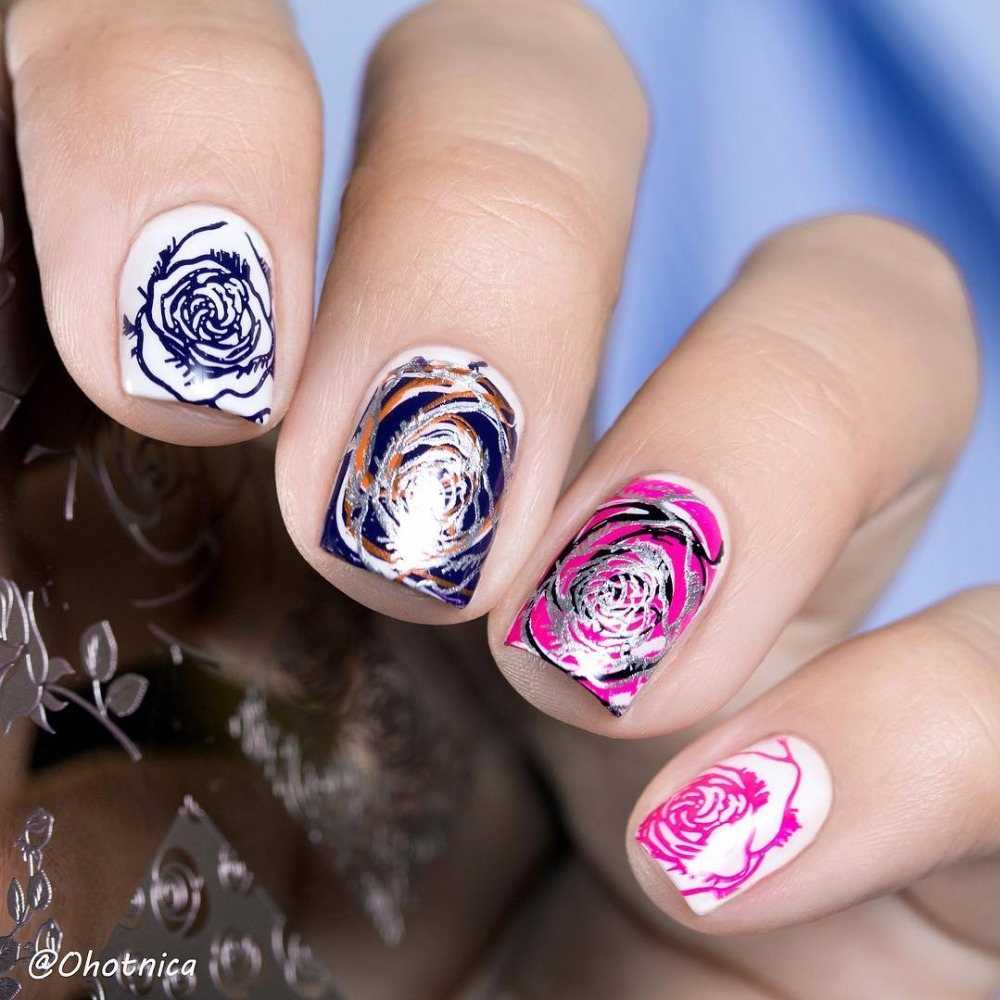 Если вы хотите сами разукрасить свою розу, то необходимо использовать стемпинг. Достаточно с помощью специального штампика и пластины с узором перенести узор на ноготь. На пальчиках будут красоваться очертания бутона, цветок можно будет наполнить любыми оттенками по желанию.