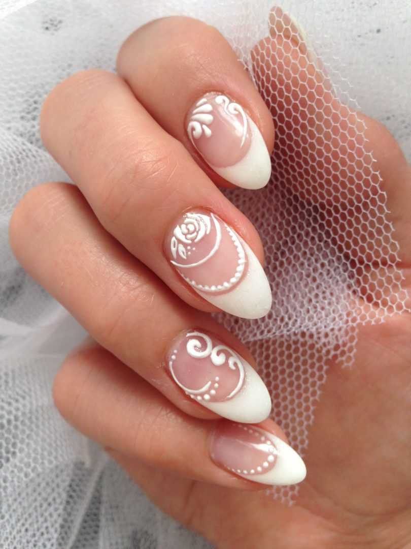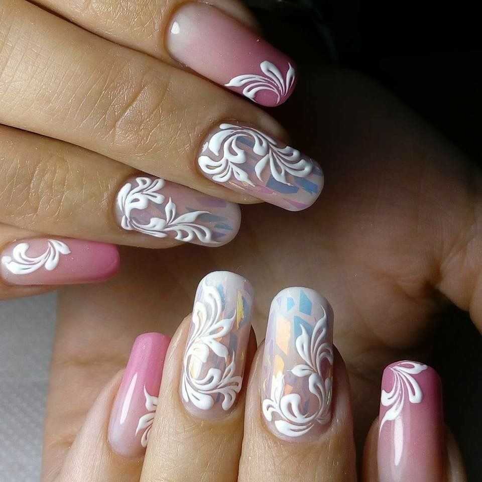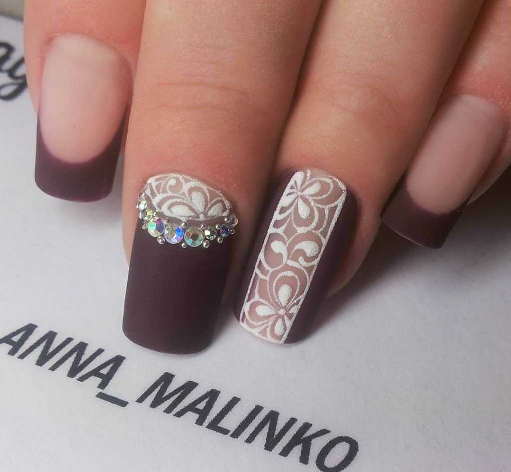 - белые кружева. Чтобы подчеркнуть чистоту и женственность, воспользуйтесь двумя базовыми цветами — белый и бежевый. Техника до неприличия проста: создайте бежевую подложку ногтя и оформите ноготь кружевной росписью;
