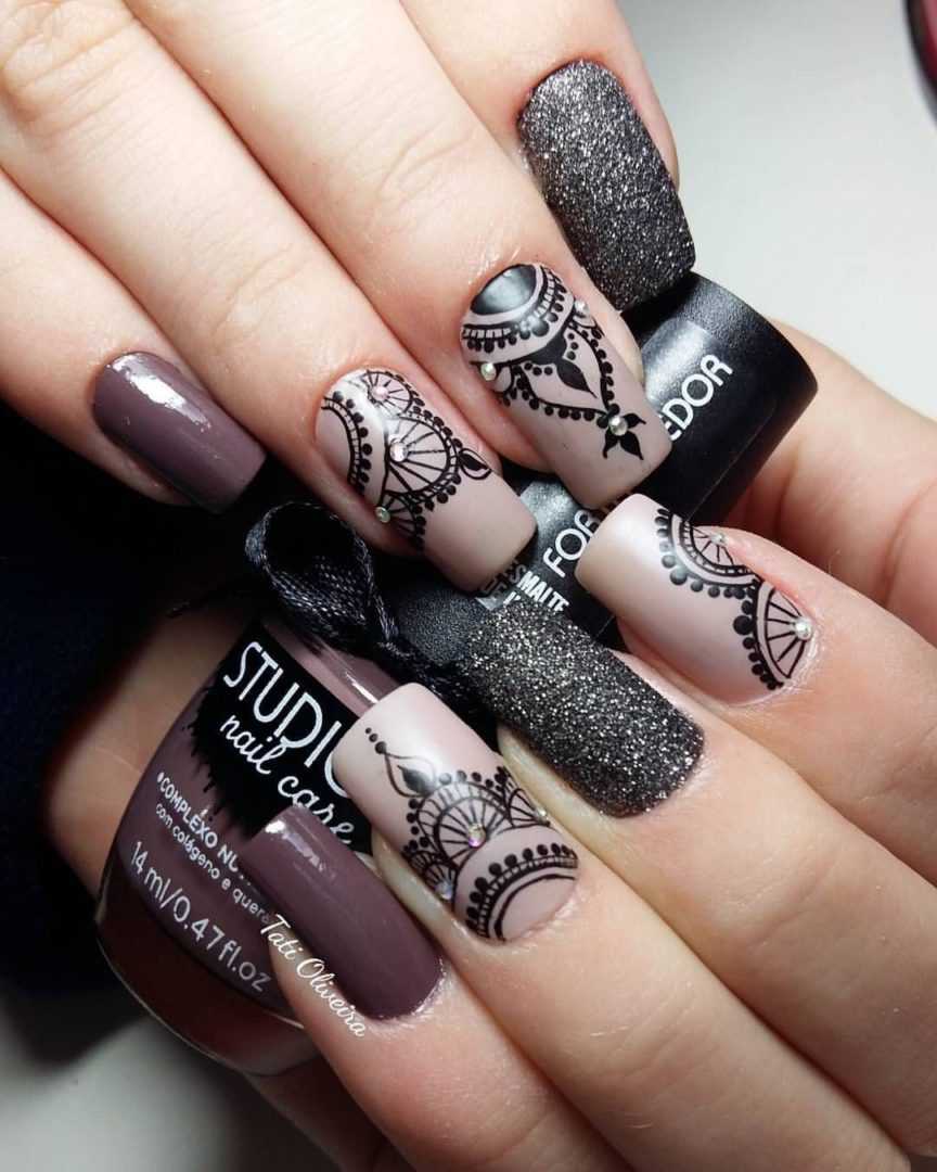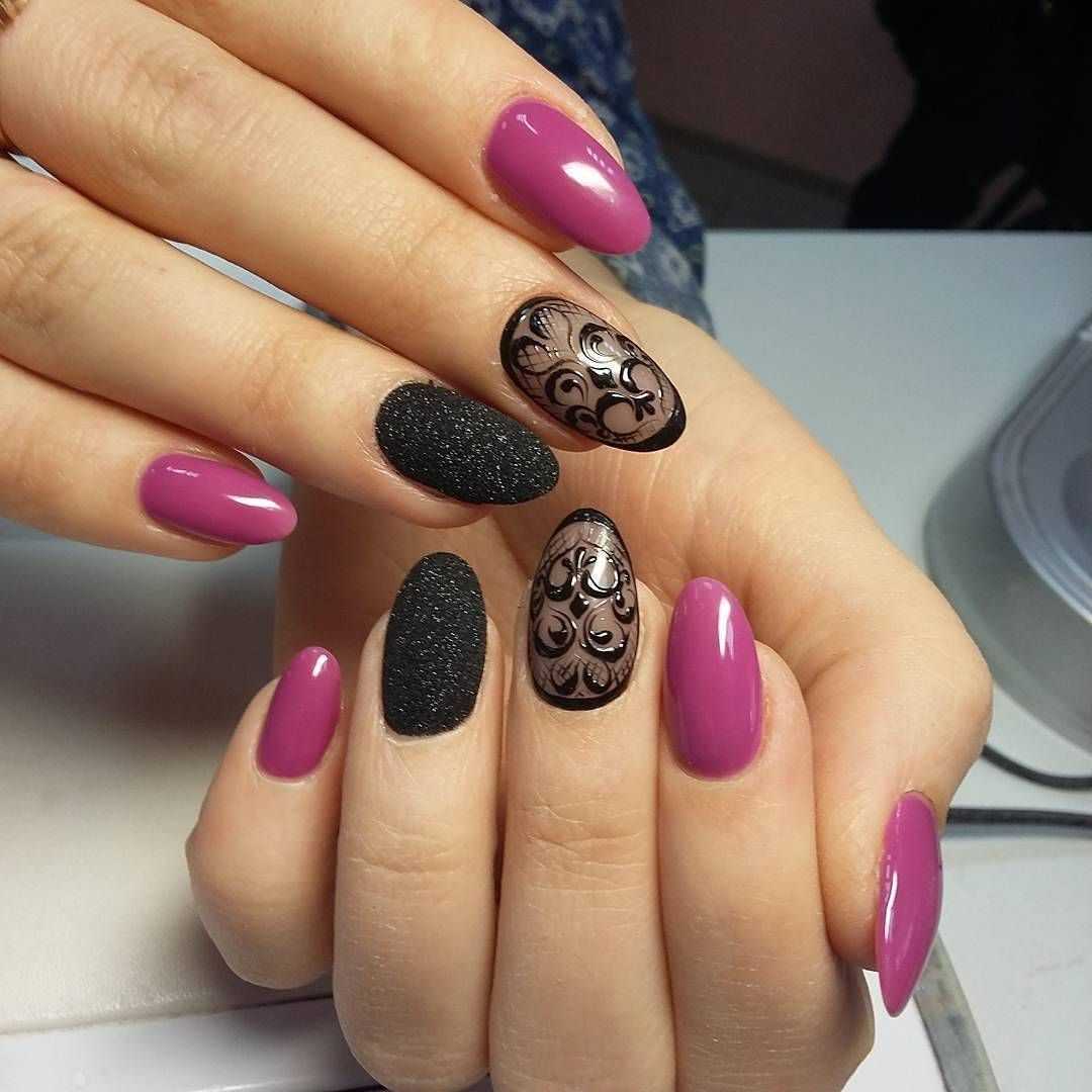 Маникюр с вензелями и завитками выглядит достаточно торжественно и броско. Но можно сделать его еще выразительнее, если использовать популярный среди мастеров прием сочетания фактур.