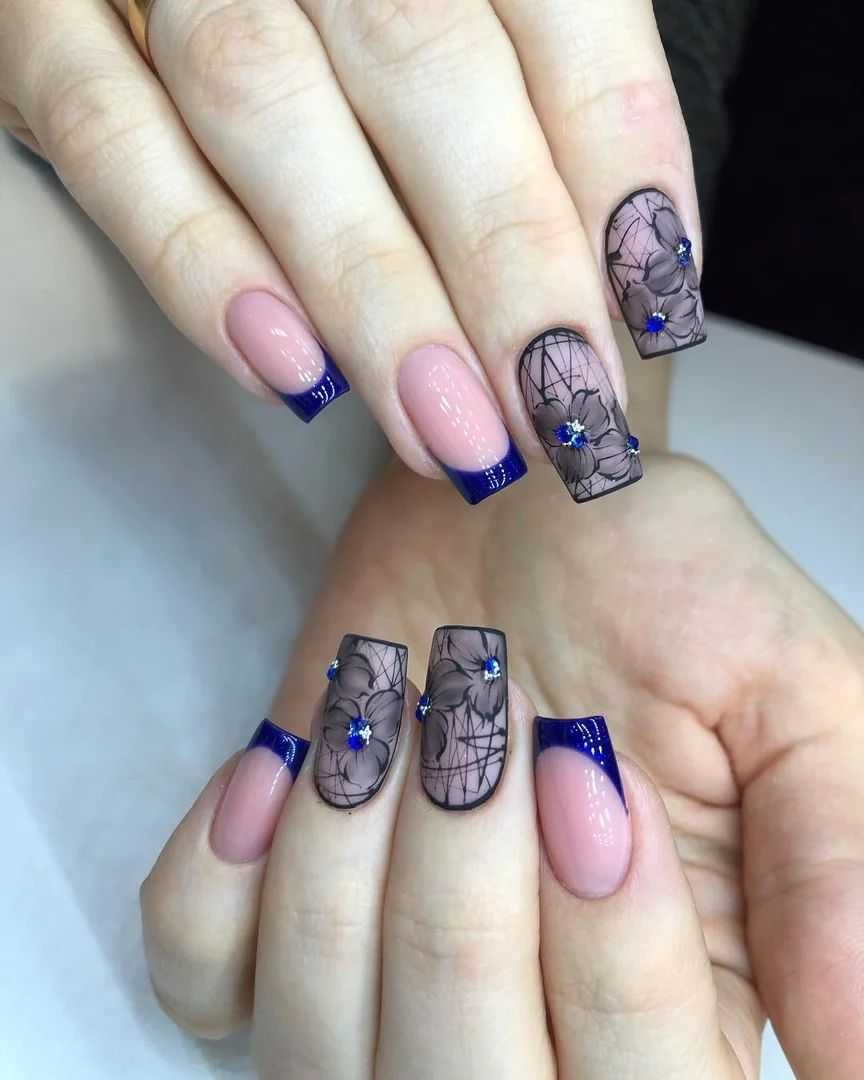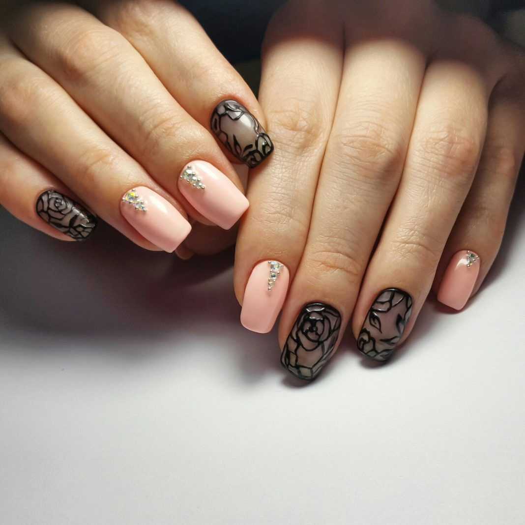 - стразы под покрытие. Ещё одно популярное решение — это поместить под подложку стразы разного размера, а на остальные ногти нанести ажурный рисунок.