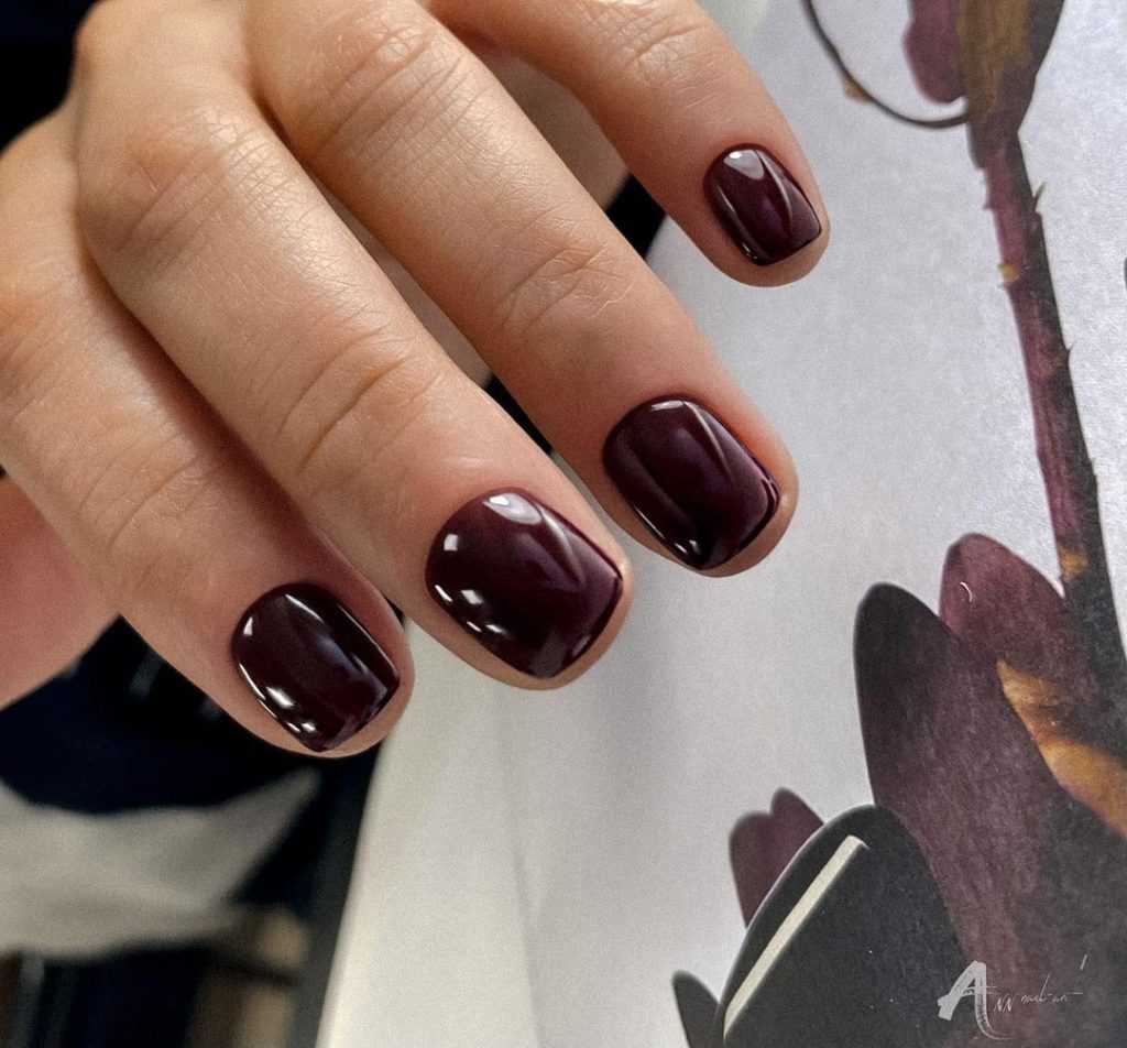 Вишневый оттенок – один из оттенков фиолетового с черным подтоном. Хотя этот цвет хорошо сочетается с офисными и городскими образами, для формальных нарядов маникюр вишневого оттенка просто непревзойден.