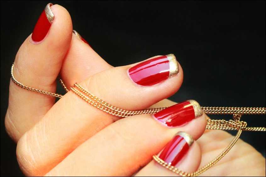 Маникюр красный с золотом, фото которого вы можете увидеть ниже — образец скромного, но стильного дизайна. Французский маникюр с красным кончиком и тоненькими ниточками золота может использоваться в повседневной жизни, даже ели на работе придерживаются дресс-кода. Невероятно милый, женственный и утонченный дизайн.