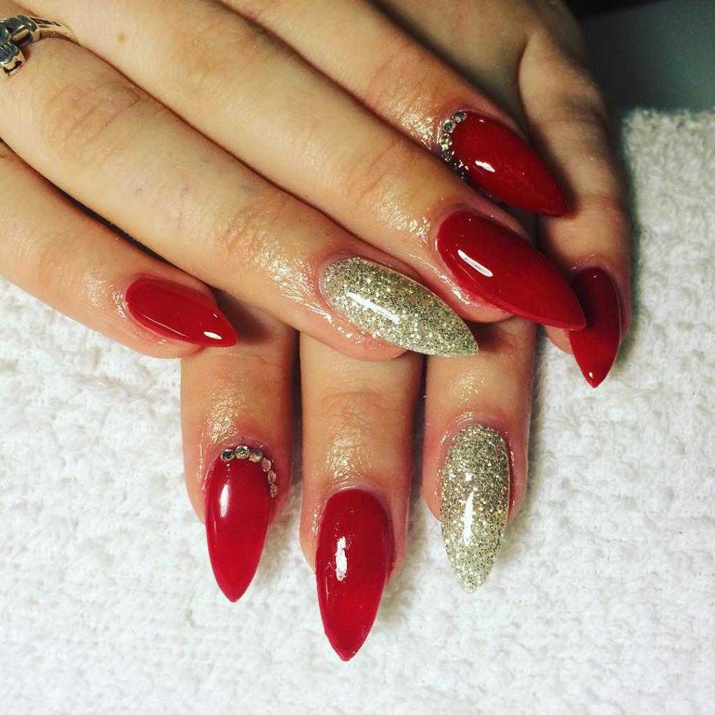 Соблазнительный стиль одежды помогут подчеркнуть ноготки острой формы, усыпанные золотым глиттером или элегантным орнаментом по всему ногтю.