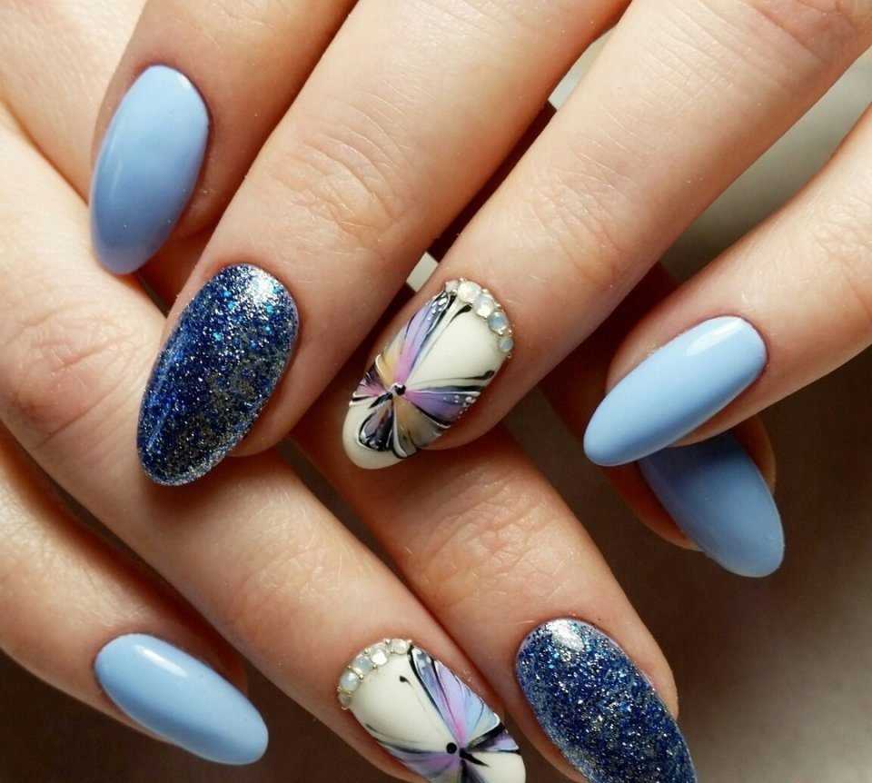 Для нанесения рисунка потребуется плоская, короткая и длинная волосковые кисточки. Дизайн выполнен гелевыми красками и дополнительно украшен голубыми стразами на крыльях бабочки.