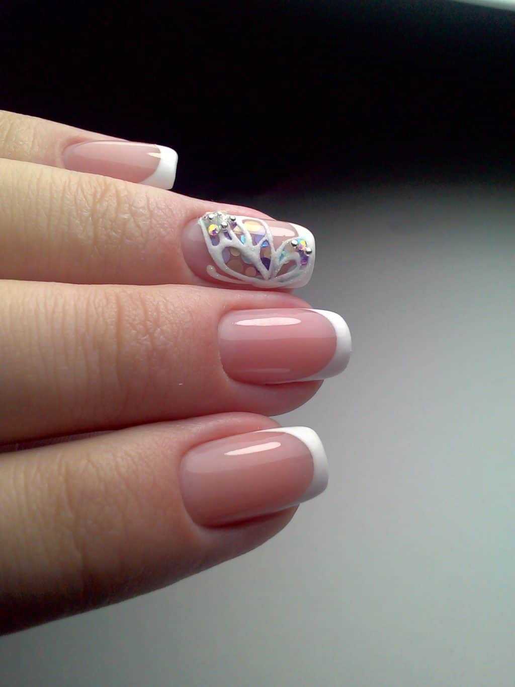 В зависимости от желания французский маникюр с бабочками выполняется на коротких, средних или длинных ногтях. Также форма ногтевой пластины большого значения не имеет, поскольку бабочка украсит любую длину и форму ногтя. Красиво и нежно выглядит френч с дополнением в виде бабочки, когда основным покрытием является натуральный или прозрачный тон. Если вы решили поразить окружающих ярким летним французским маникюром – выбирайте яркие контрастные тона. При выполнении такого дизайнерского решения есть одно условие: чтобы маникюр выглядел элегантно и красиво, изображение бабочек наноситься на один или два ноготка