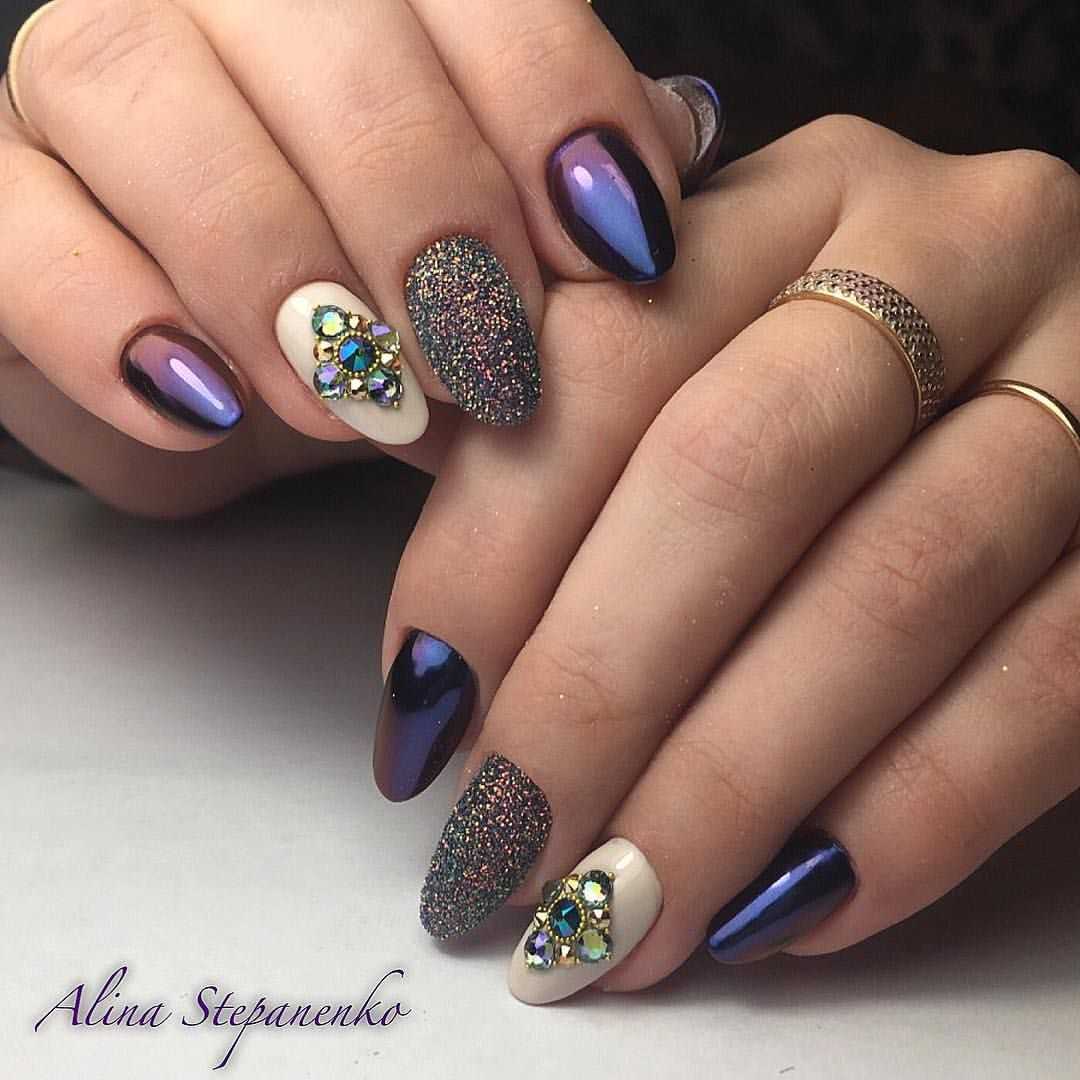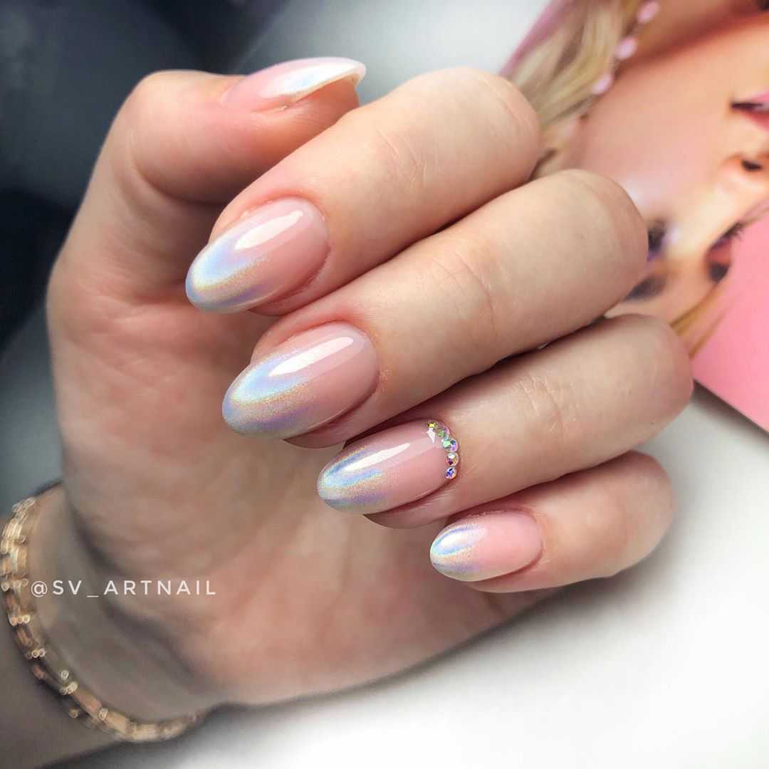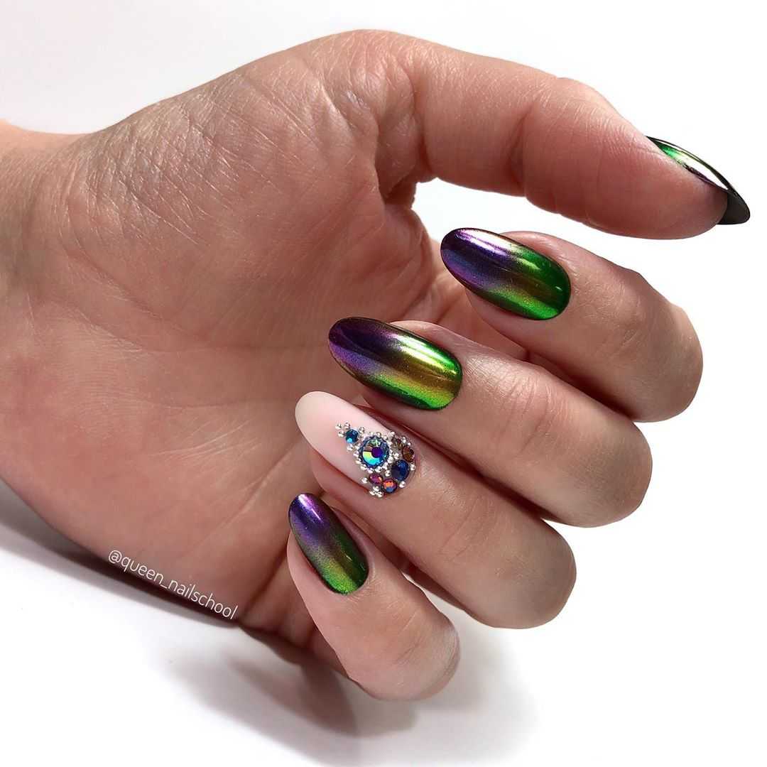 Для большей эффектности, втирку объединяют с блестками, стразами. Чередуют с матирующим топом. Очень интересно смотрится техника градиент или плавный переход от зеркальной поверхности к матовой на одной пластинке.