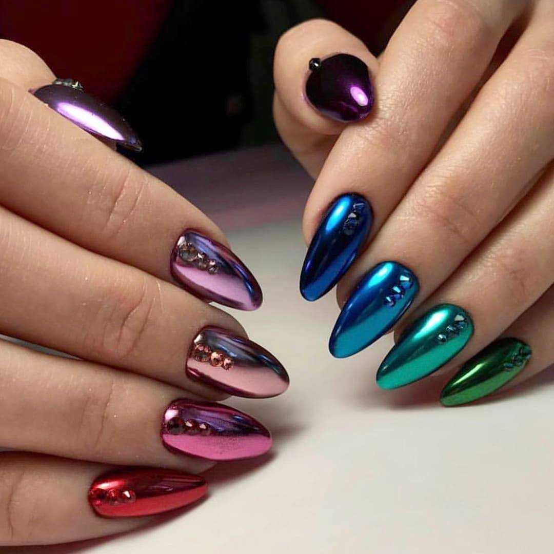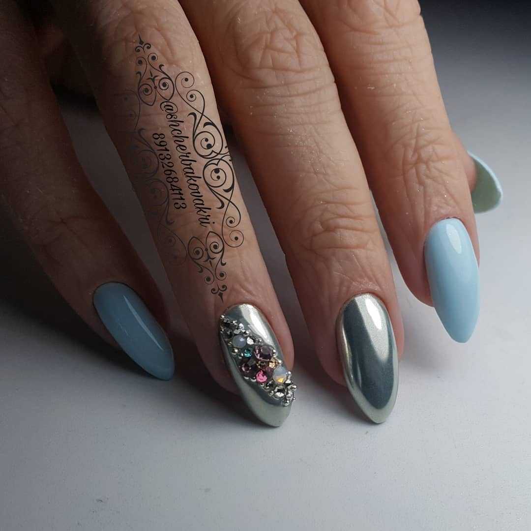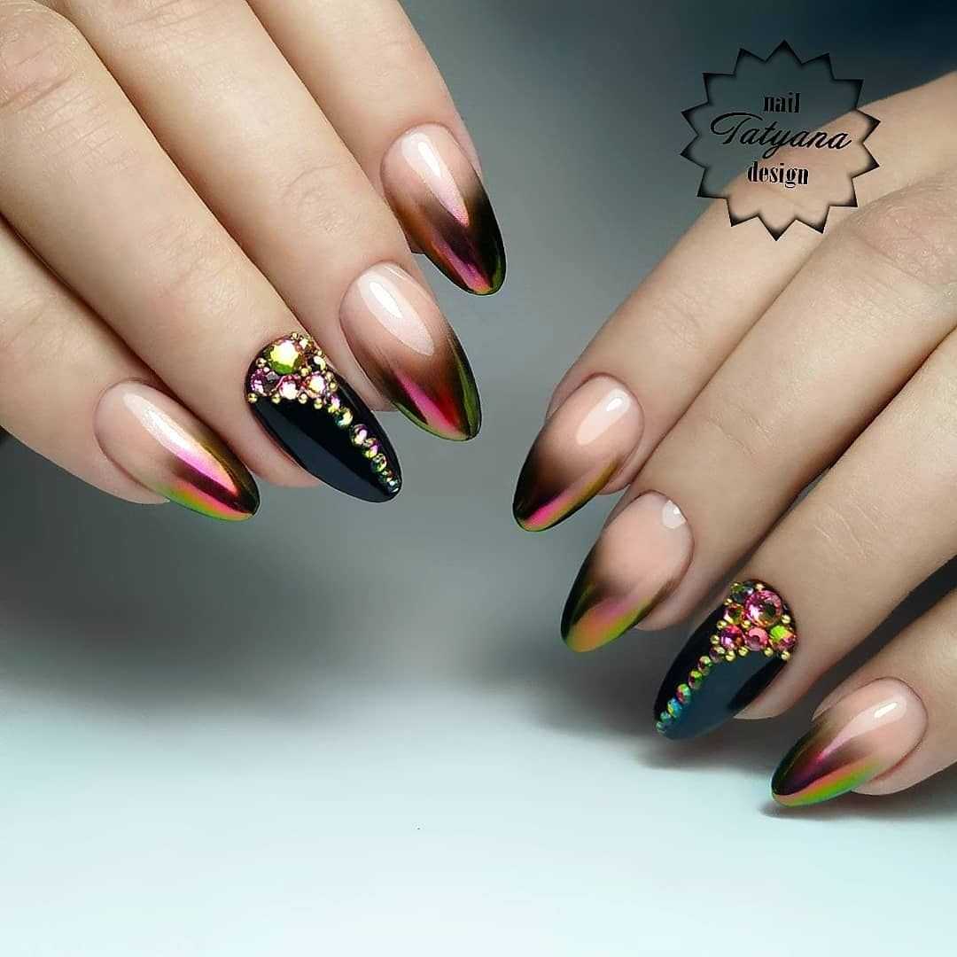 Для большей эффектности, втирку объединяют с блестками, стразами. Чередуют с матирующим топом. Очень интересно смотрится техника градиент или плавный переход от зеркальной поверхности к матовой на одной пластинке.