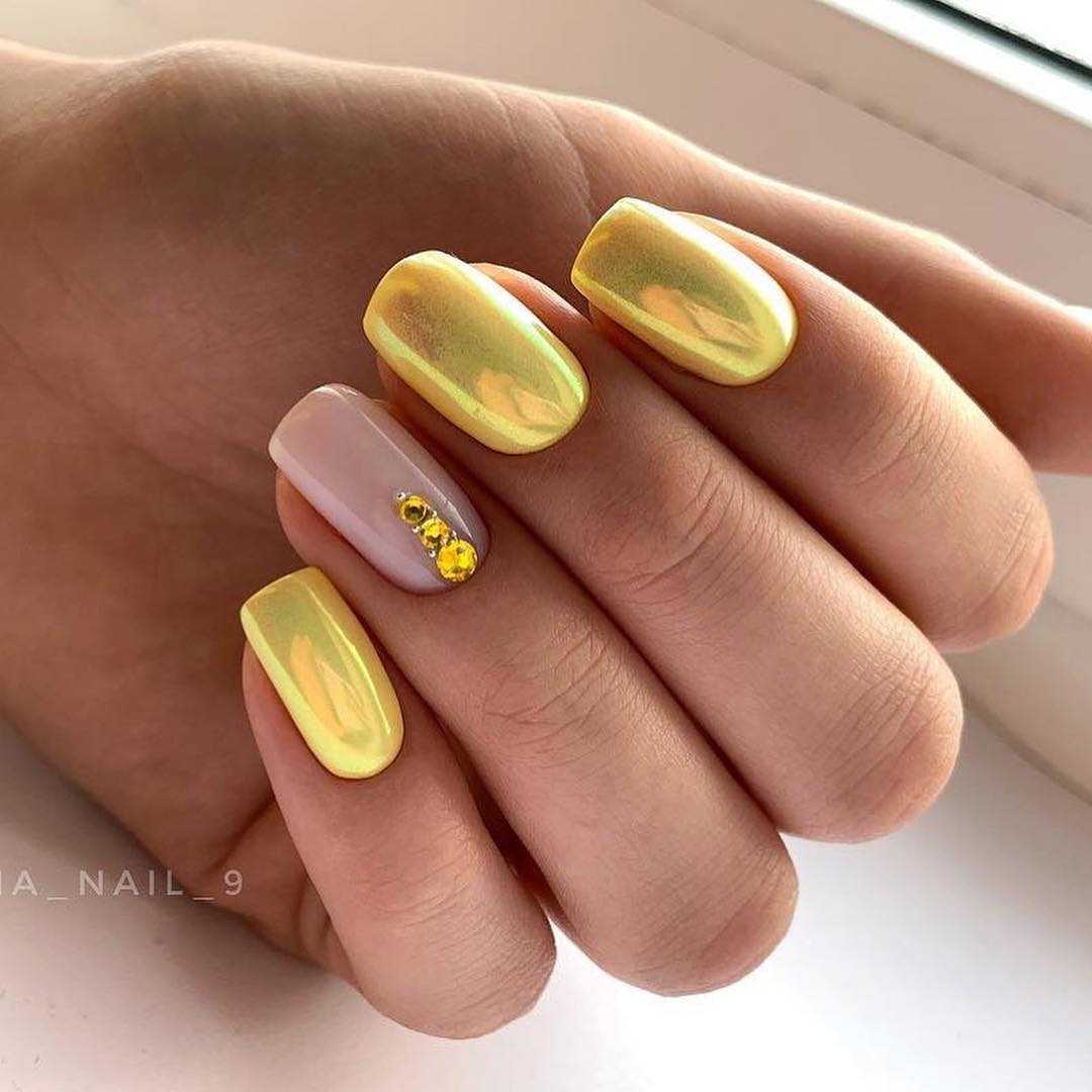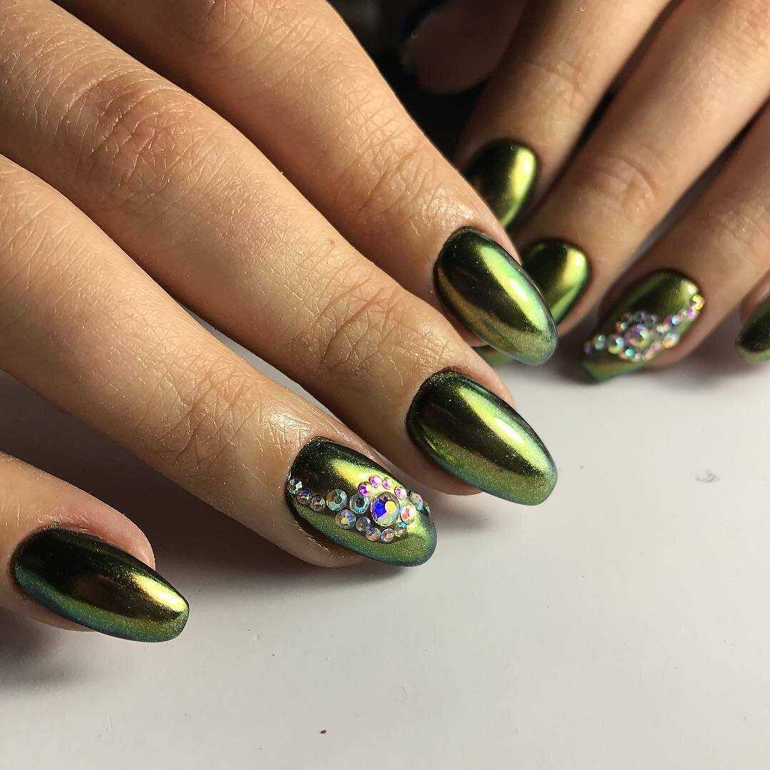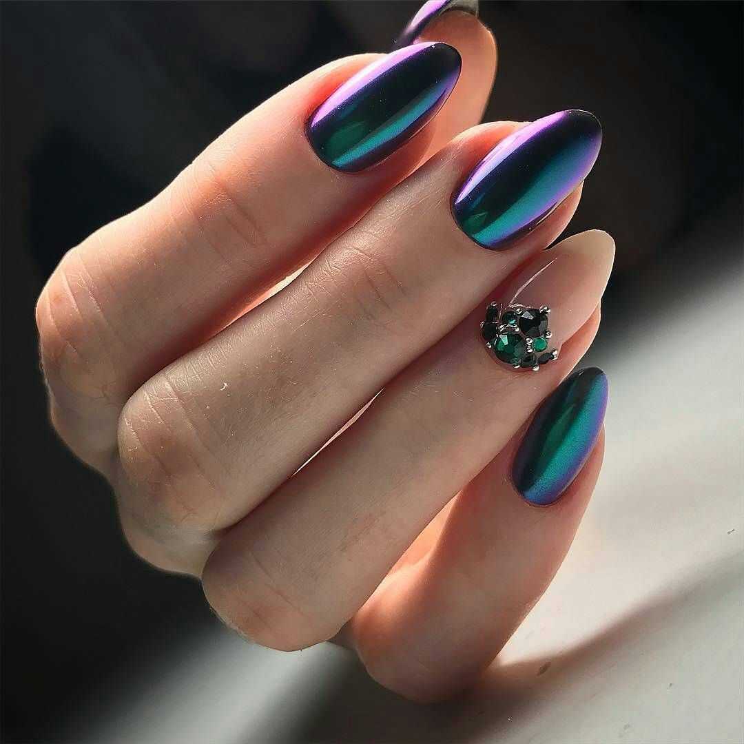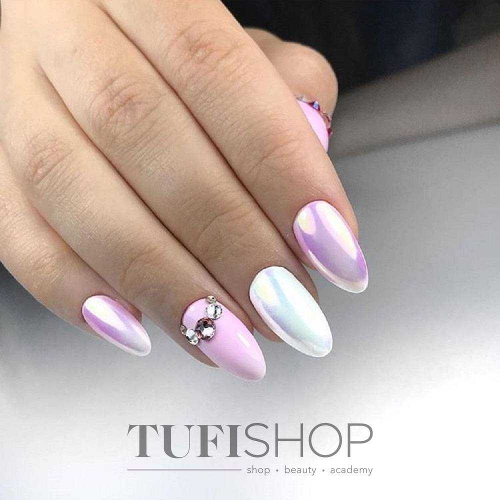 Это самый эффектный и дорогой вариант пигмента. Выглядит на ногтях чарующие. Как правило, применяется для простого маникюра в стиле фэн-шуй, т.к. наносить ее на все ногти будет перебор. Прекрасно комбинируется со стразами и геометрическим рисунком. Пудра с эффектом призмы из разряда эконом есть у марки NAILTES, также недорого стоит втирка TNL и NelTes. Неброский двухцветный маникюр на короткие ногти с втиркой «Призма» идеальный вариант на каждый день.
