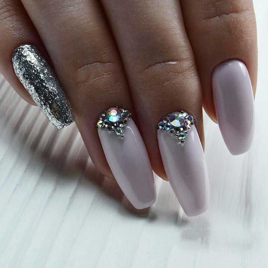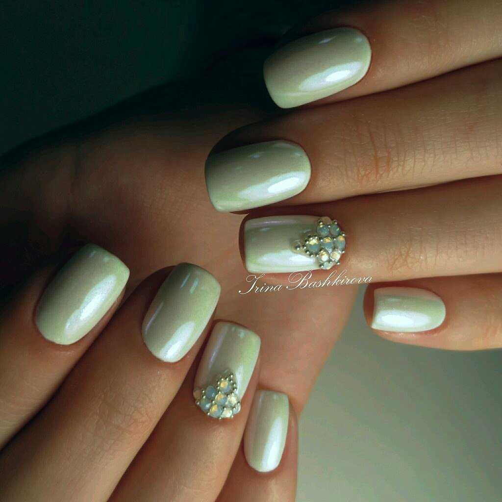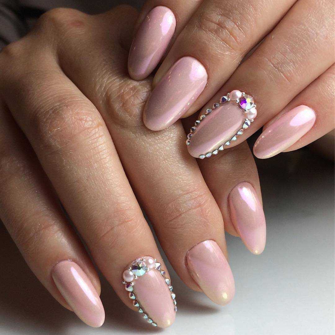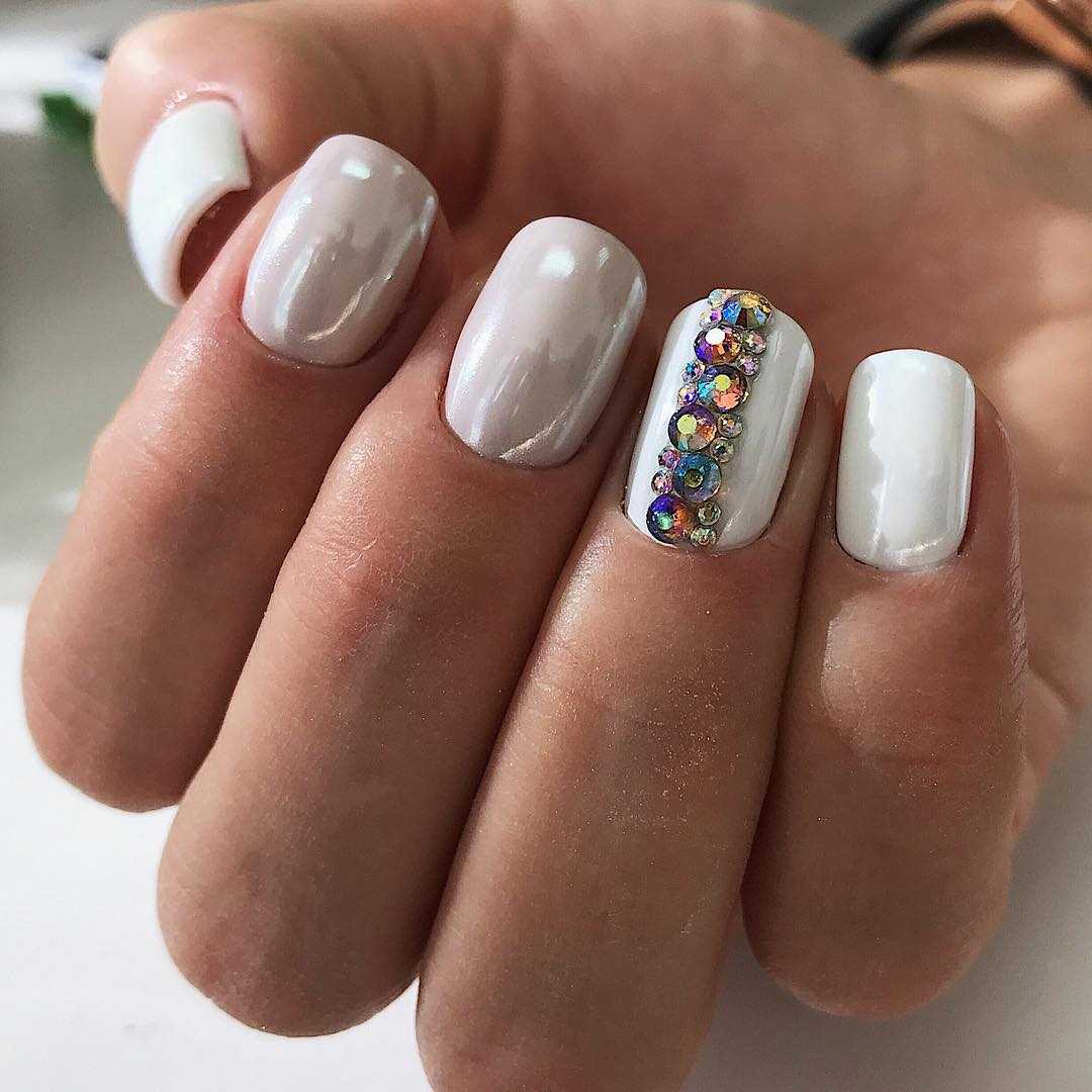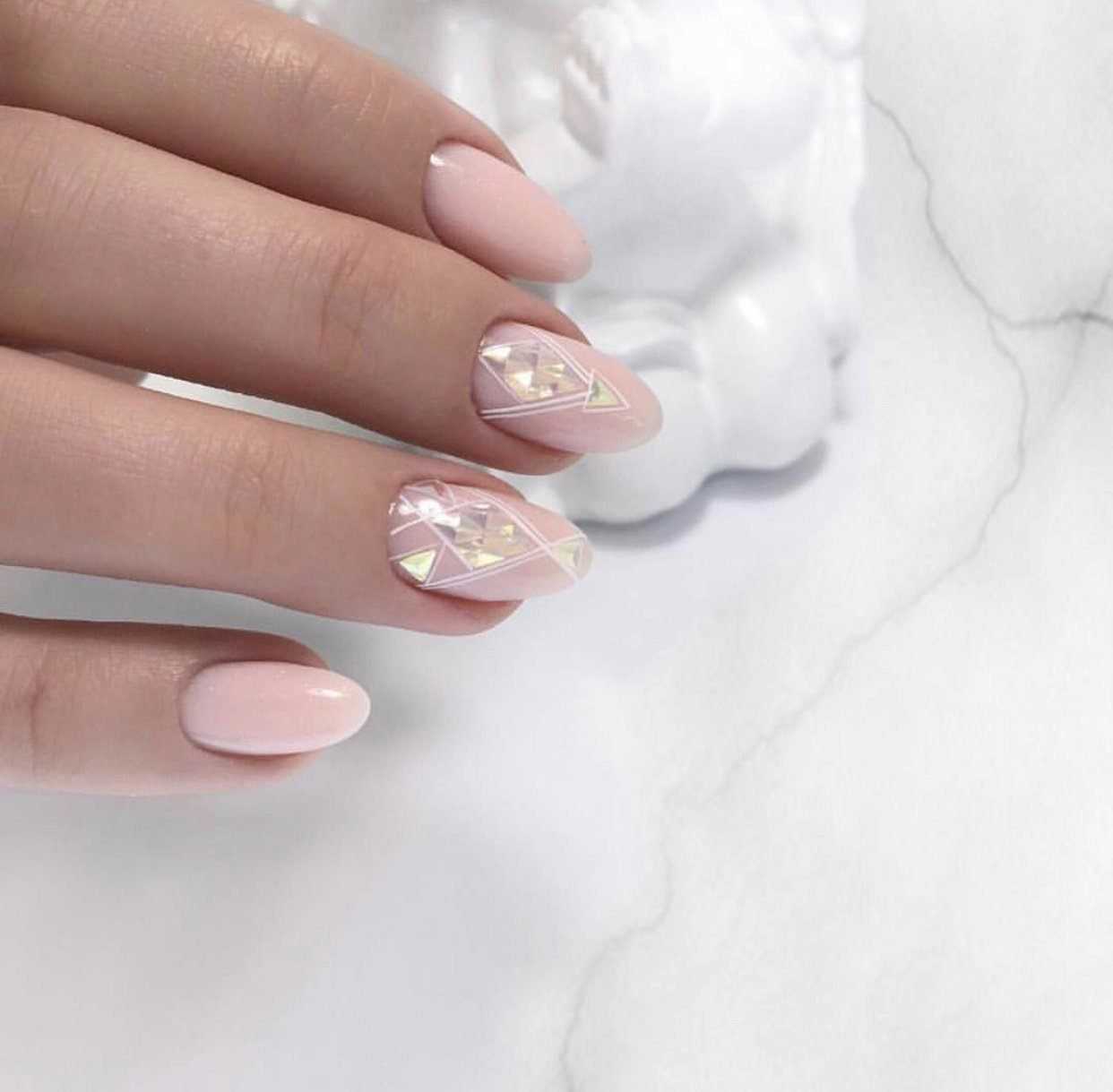 Сделать маникюр интереснее поможет добавление второго оттенка, который послужит фоном для страз. Для таких целей хороши оттенки нюда и пастельные цвета.