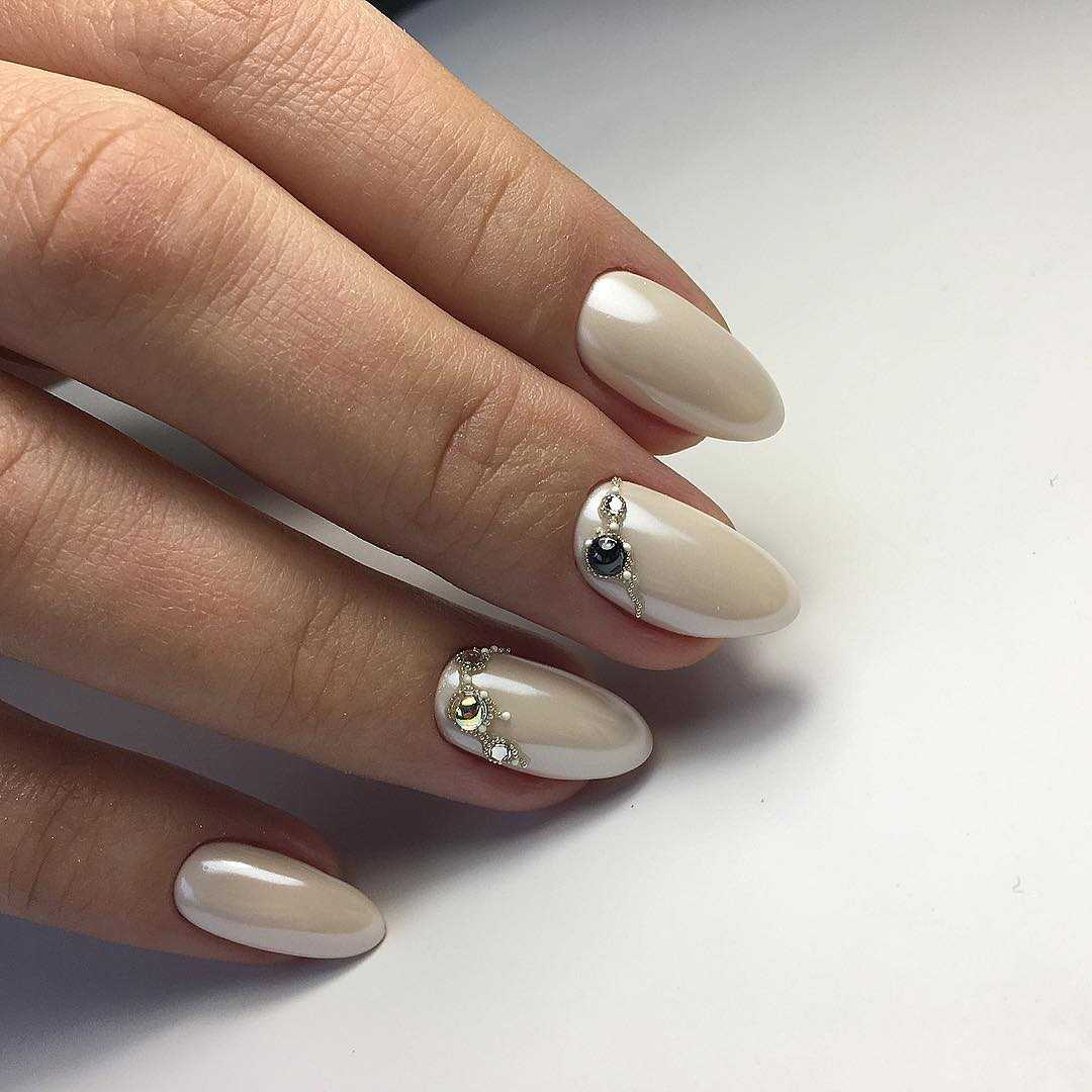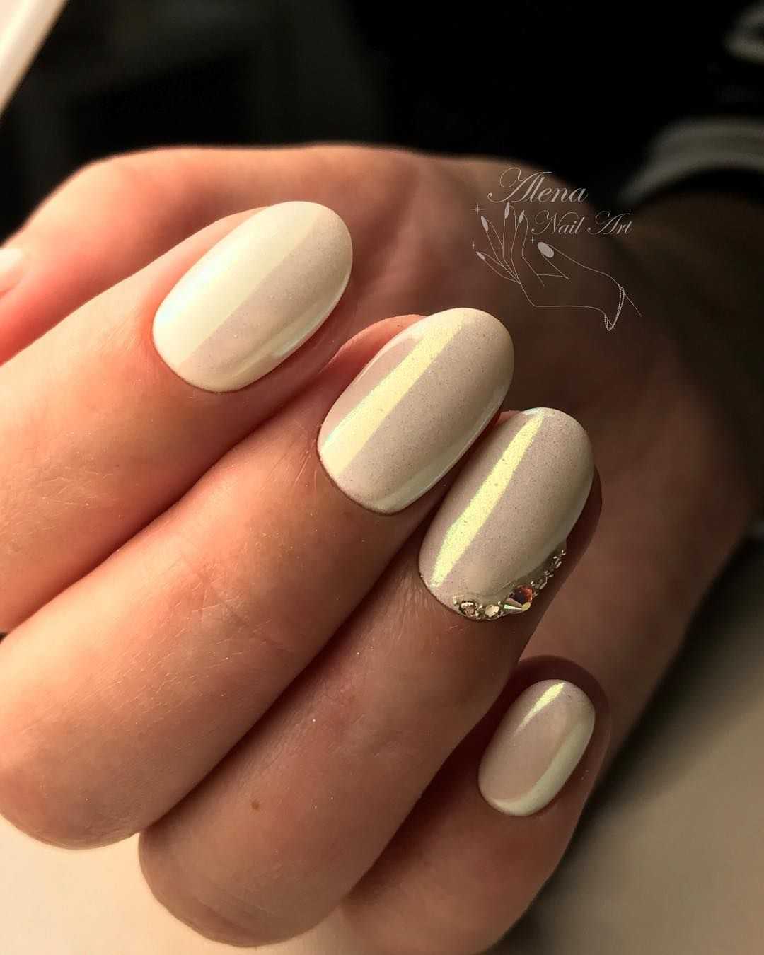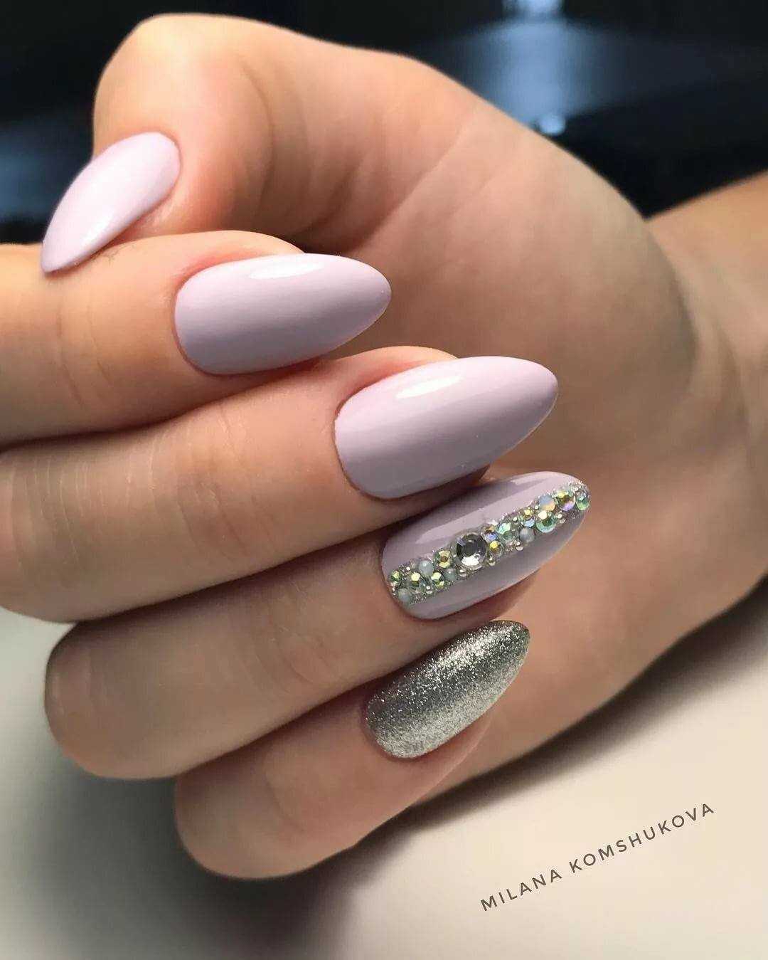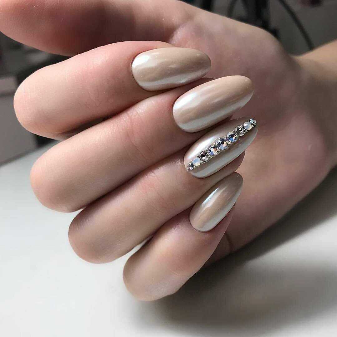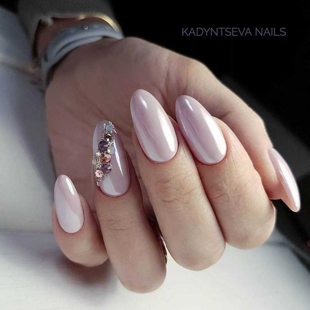 Сделать маникюр интереснее поможет добавление второго оттенка, который послужит фоном для страз. Для таких целей хороши оттенки нюда и пастельные цвета.