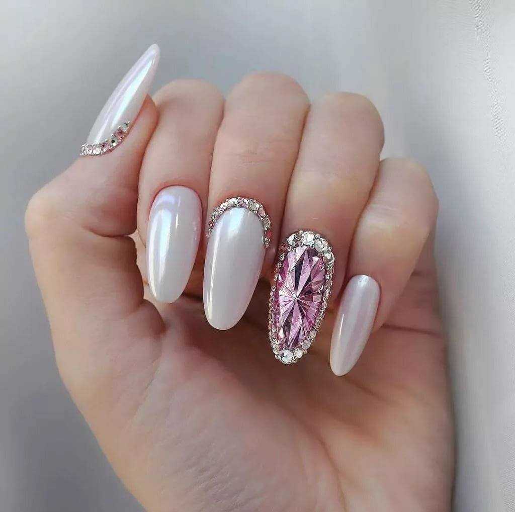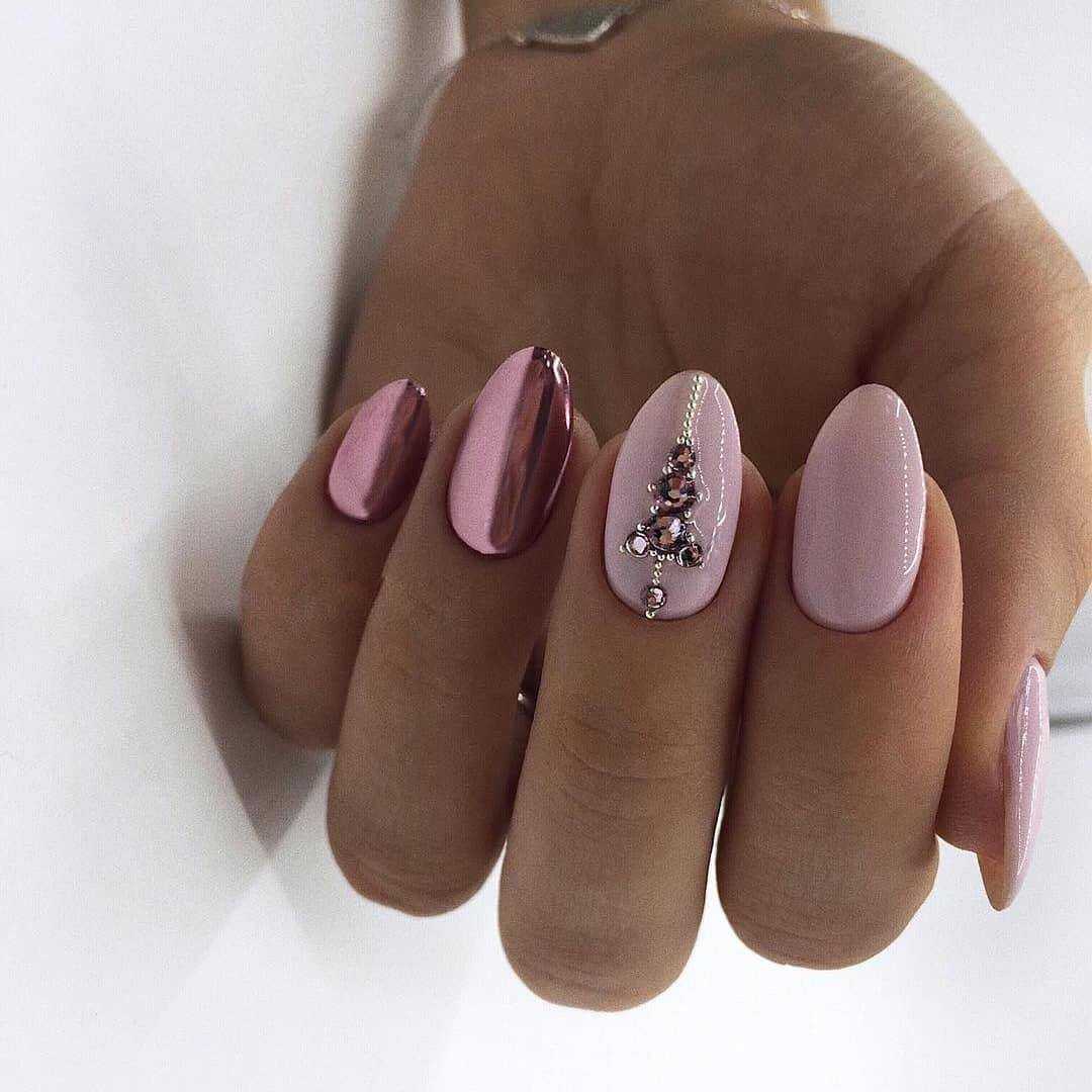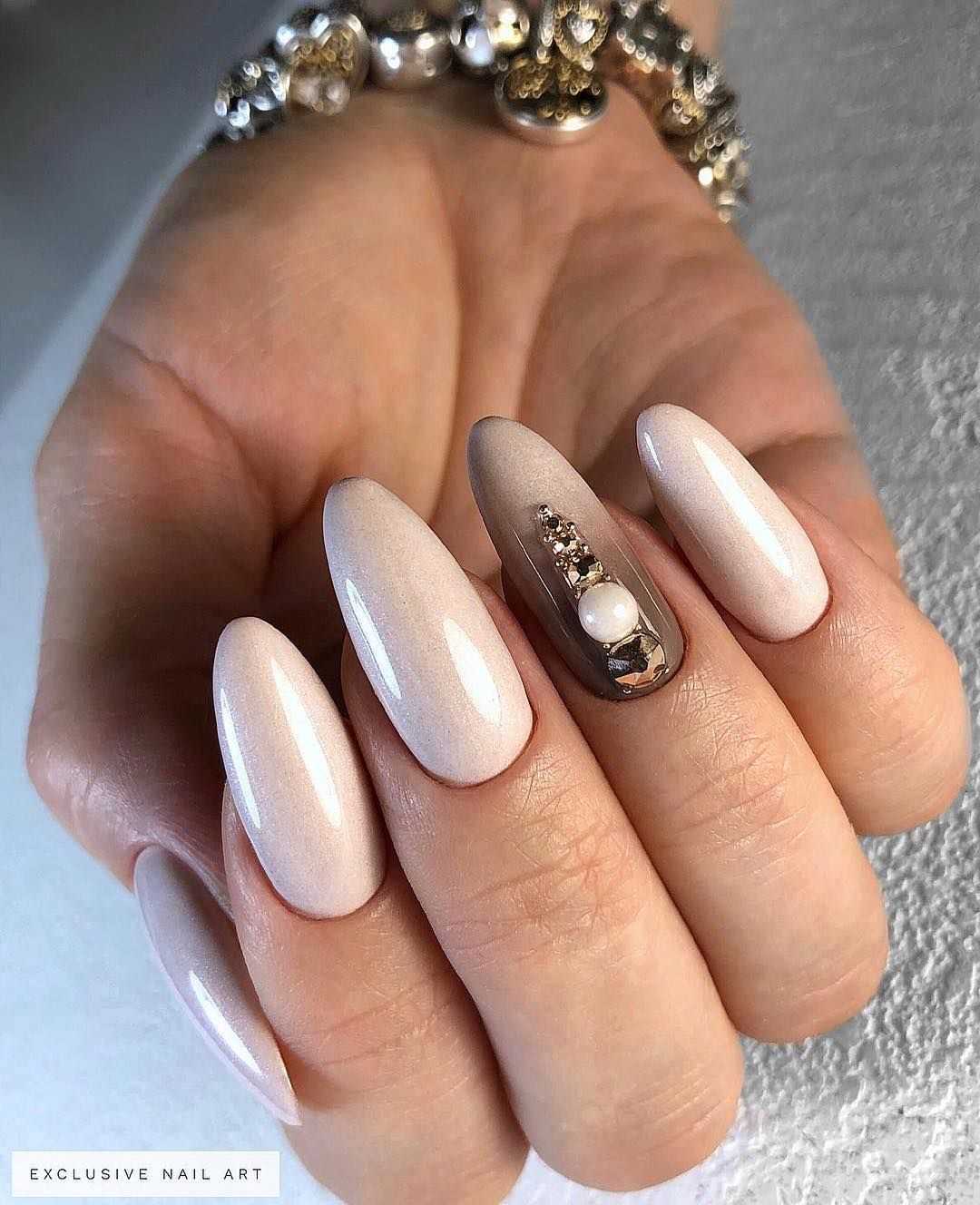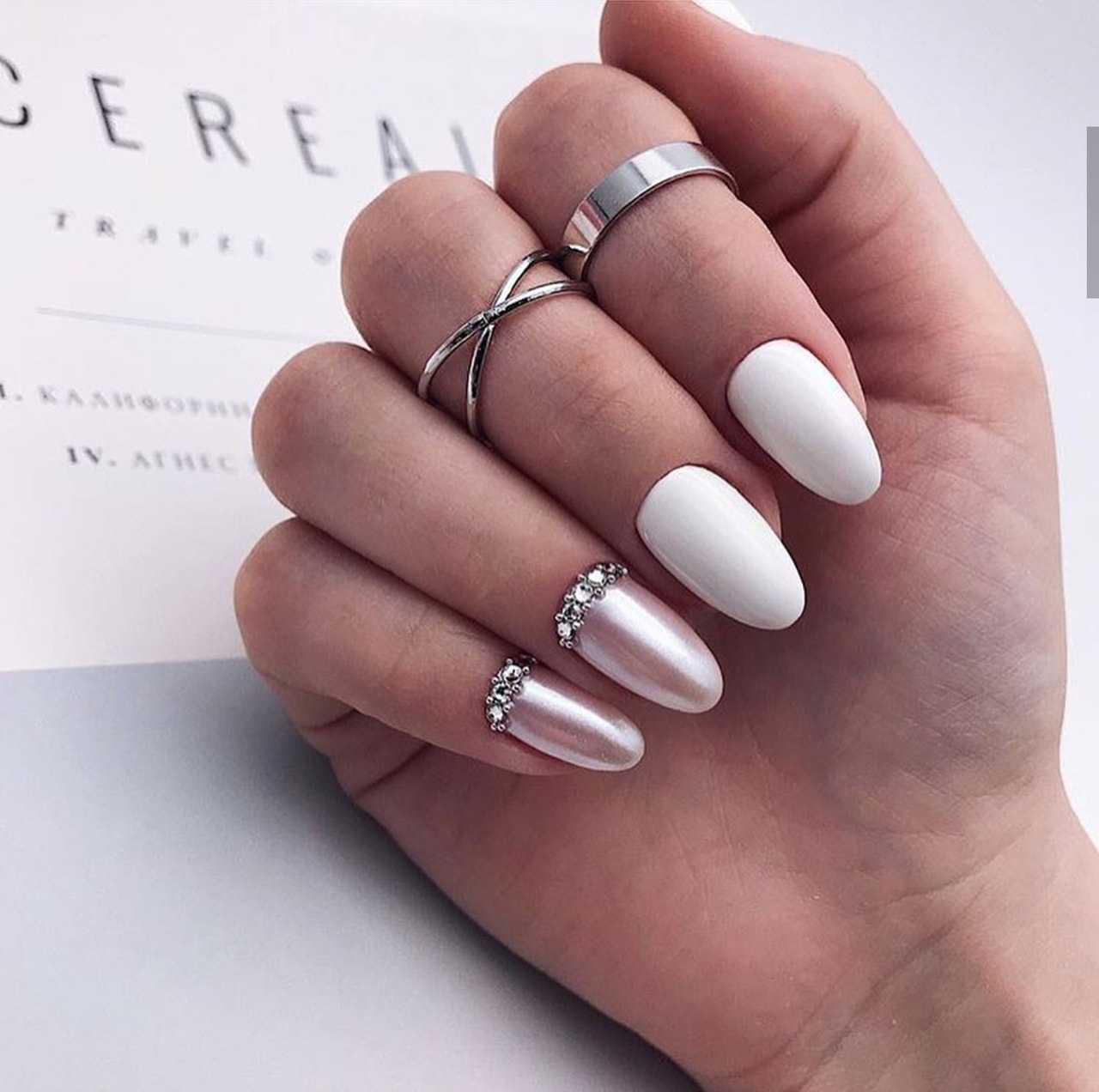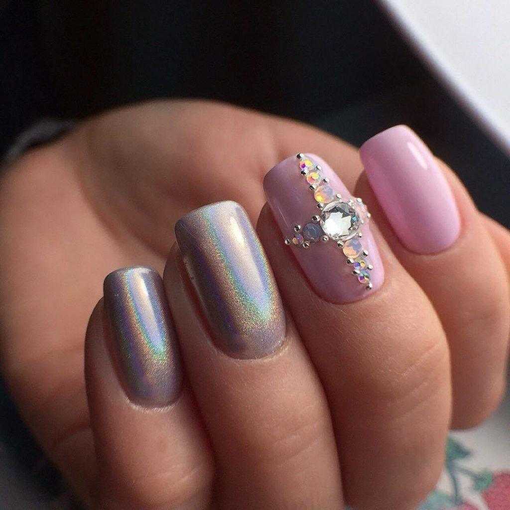 Сделать маникюр интереснее поможет добавление второго оттенка, который послужит фоном для страз. Для таких целей хороши оттенки нюда и пастельные цвета.
