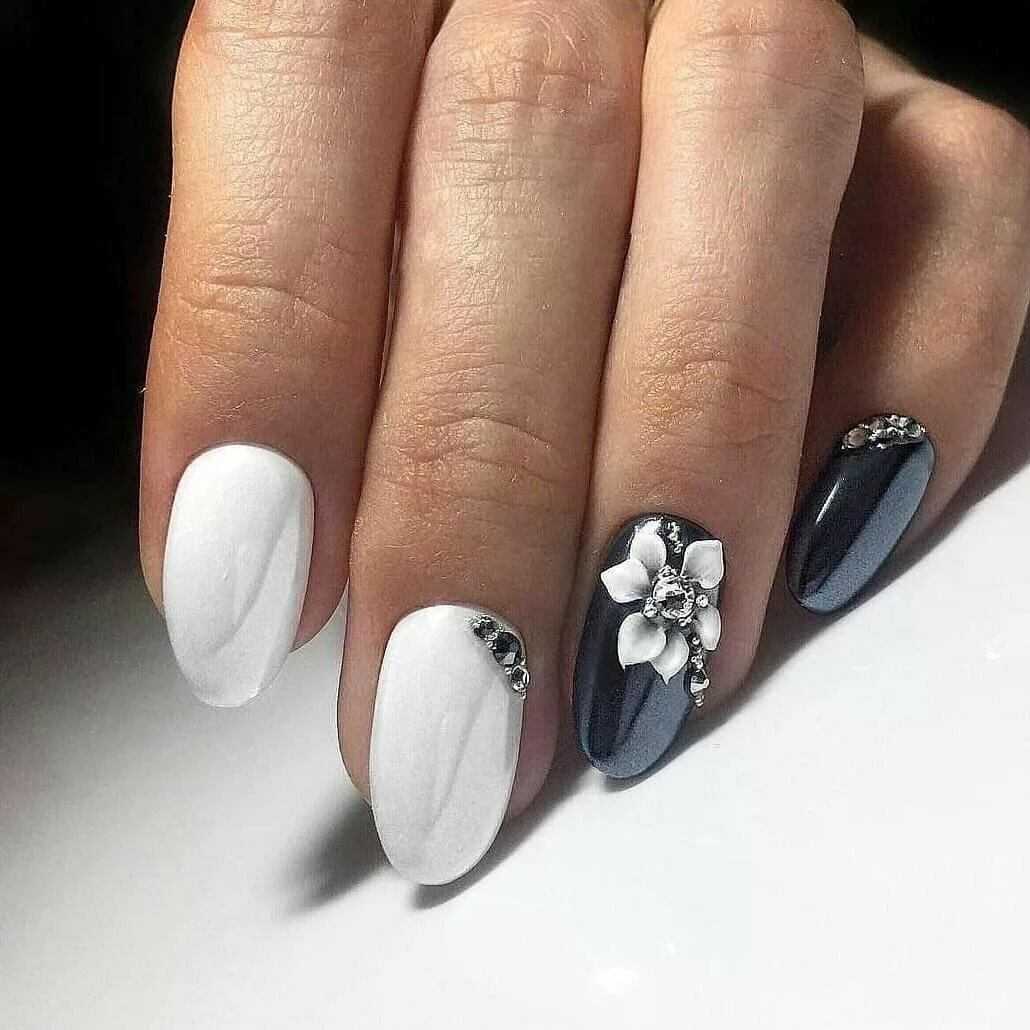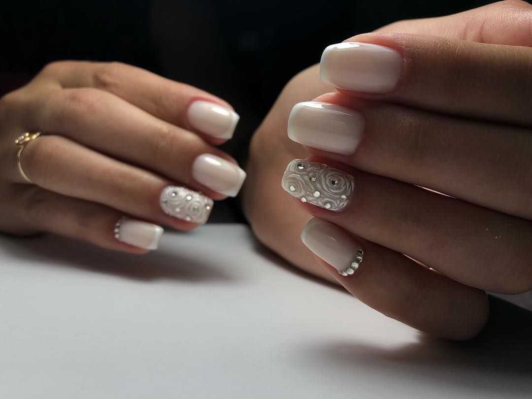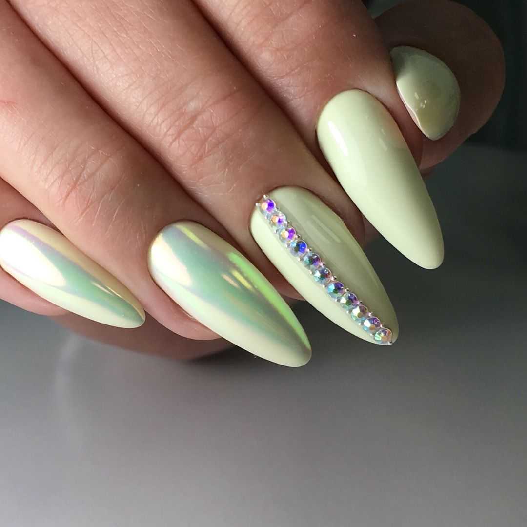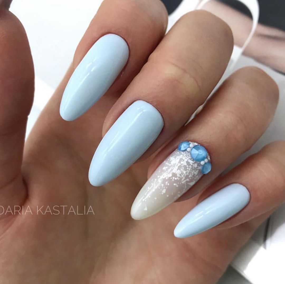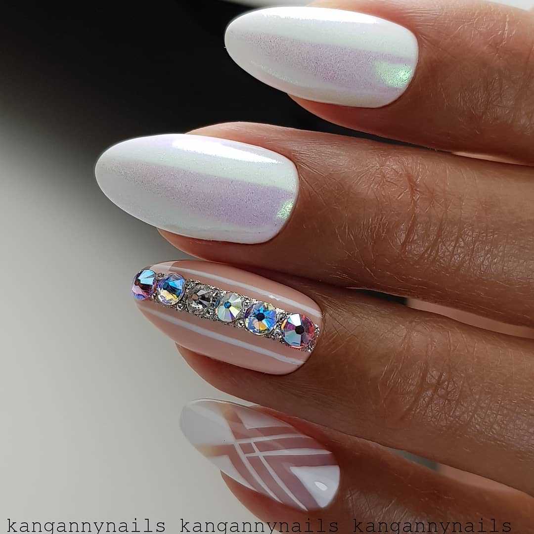 Сделать маникюр интереснее поможет добавление второго оттенка, который послужит фоном для страз. Для таких целей хороши оттенки нюда и пастельные цвета.