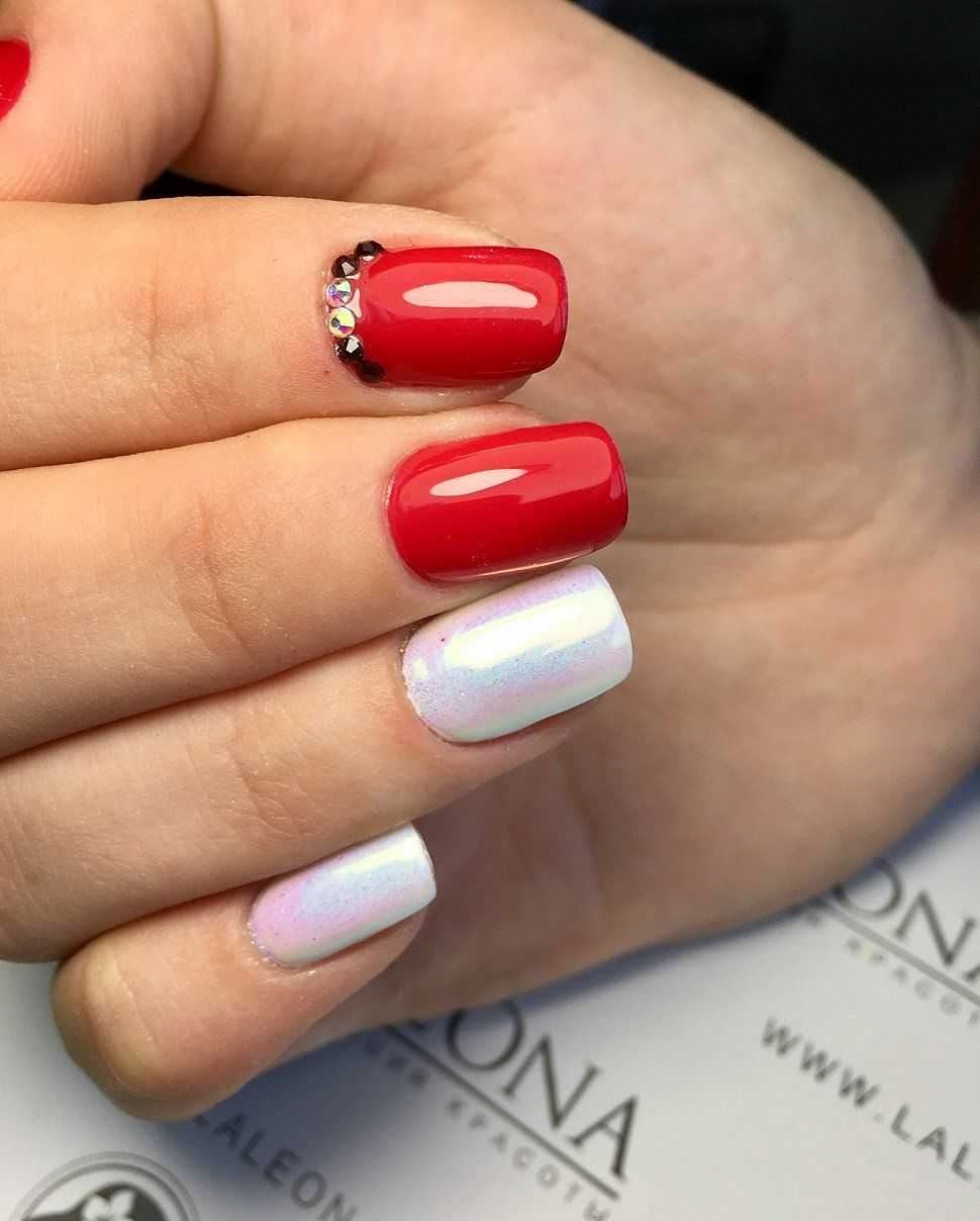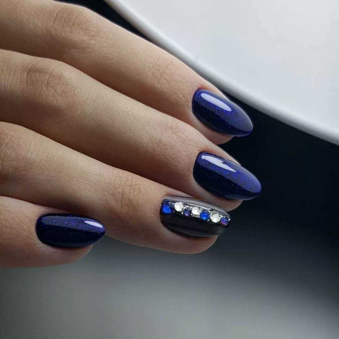 Зима в 2019 году буквально создана для холодных красок на коротких ногтях. Новинки дизайна диктуют свои правила, среди которых синие тона сочетаются с белым, голубым, черным, бирюзовым и красным. Украсит ноготки на Новый год блеск глиттера или россыпи стразов.