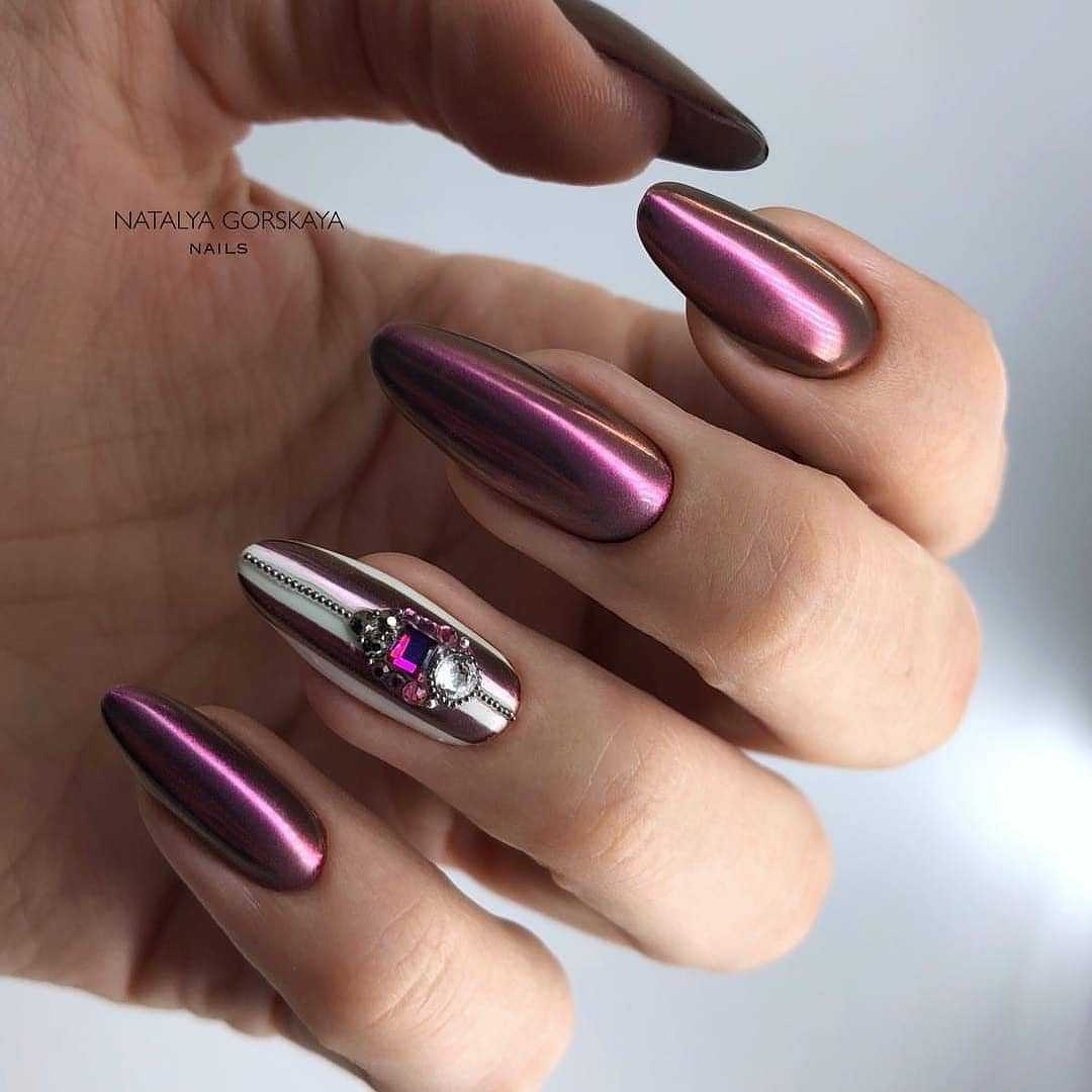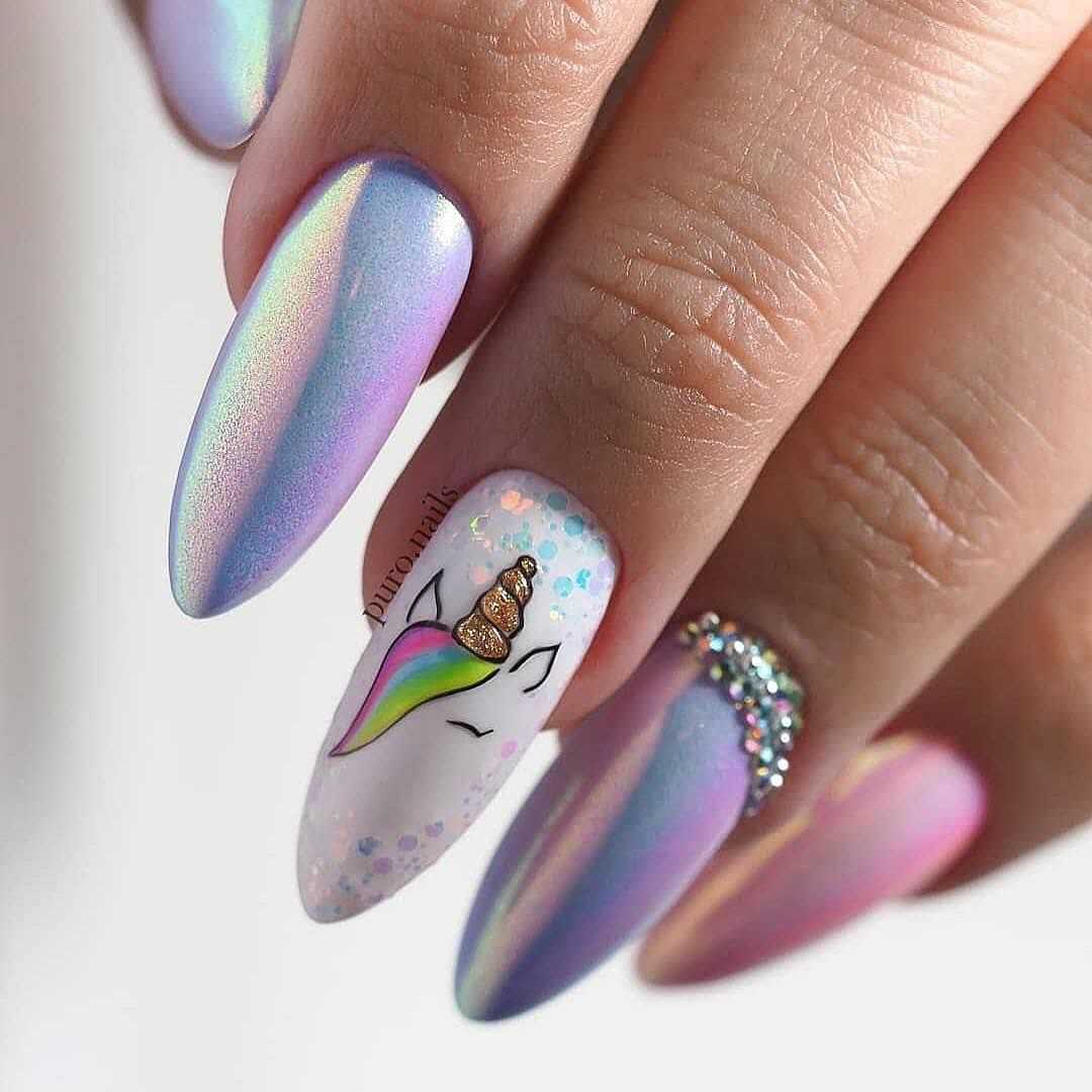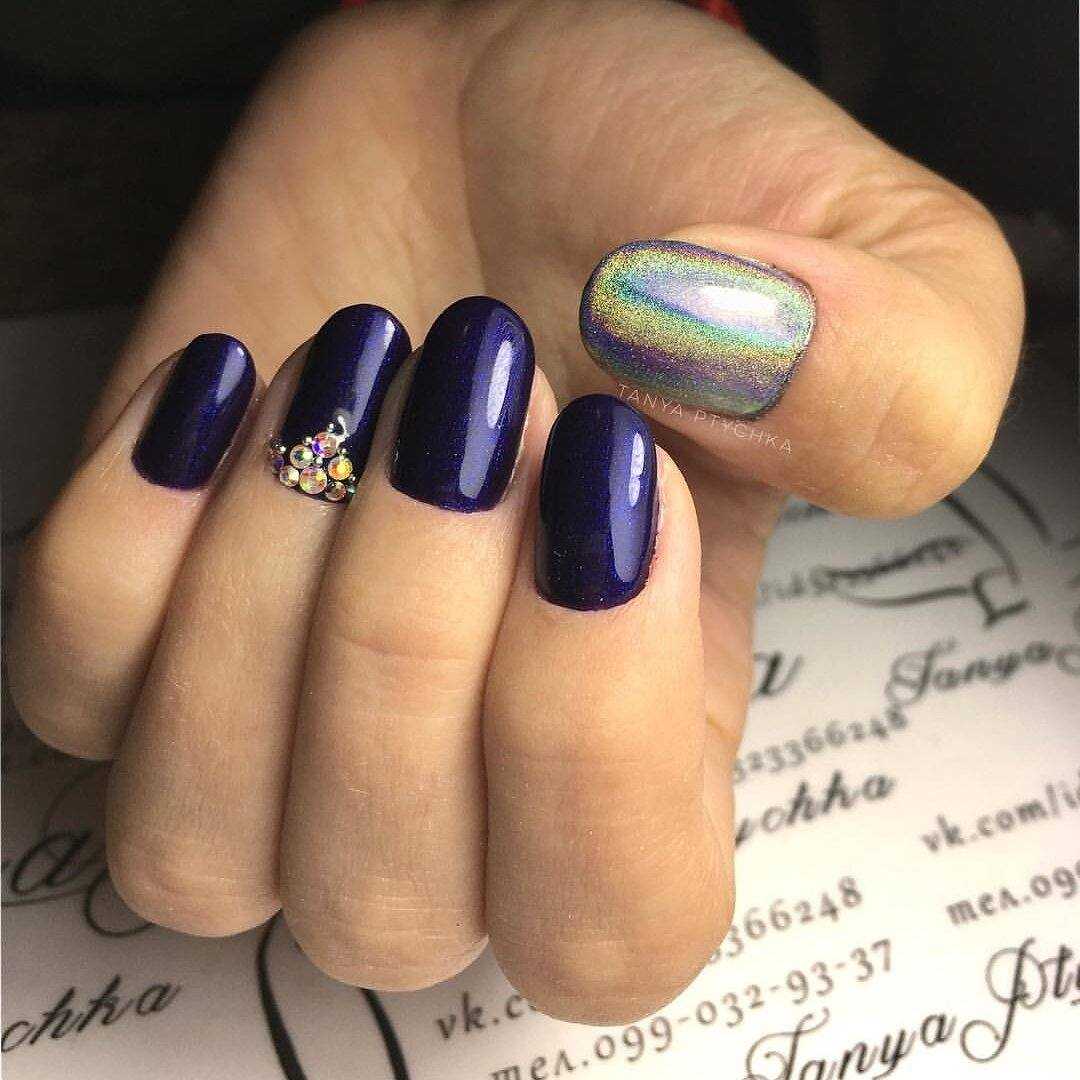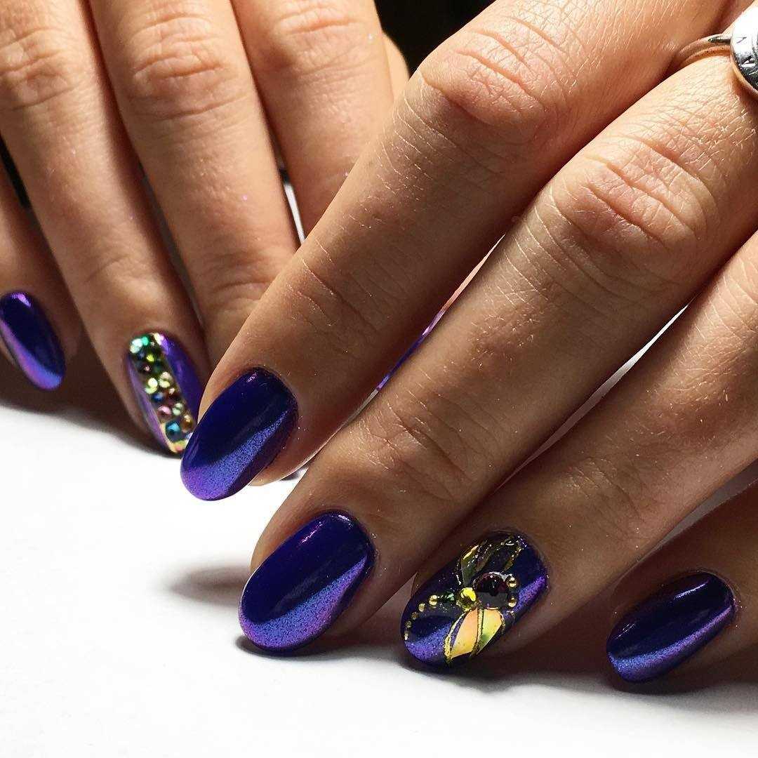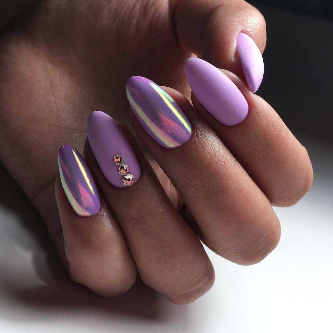 Что касается фиолетового маникюра, то он также красиво выглядит с зеркальной, голографической, жемчужной втиркой. Для создания маникюра можно использовать темно-фиолетовый гель-лак, что придает цвету насыщенность и глубину. Втирка также красиво выглядит со светлыми фиолетовыми оттенками. Визуально такой дизайн выглядит непередаваемо нежно и красиво. Такой маникюр часто дополняют декором с тематикой единороги, стразами и матовой текстурой.