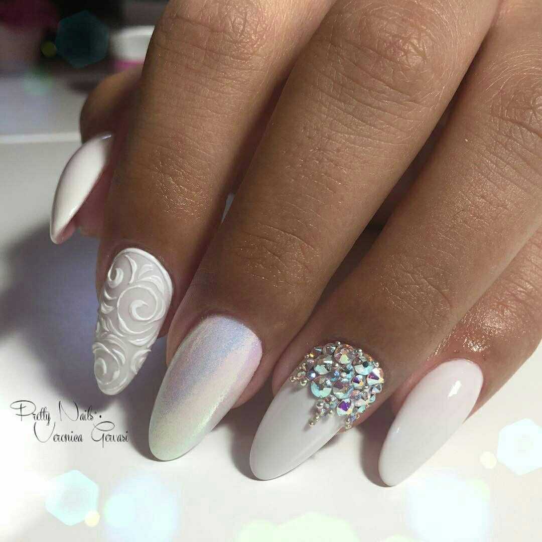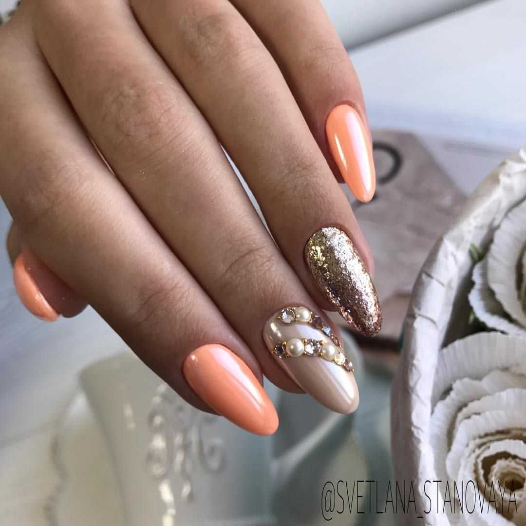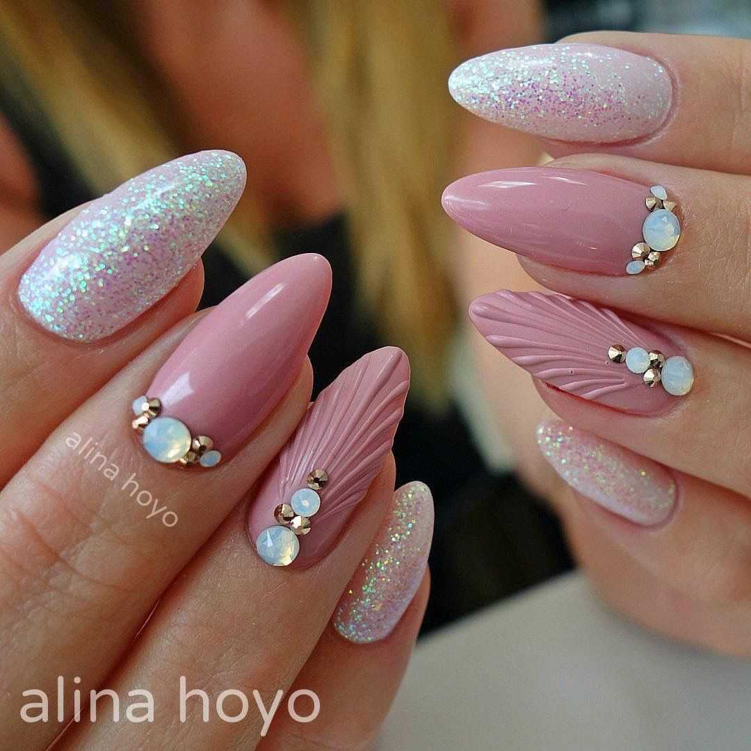 Придать торжественности помогут блестки. Маникюр с блестками подходит и для свадьбы, и для работы, и для деловых встреч. Главное – не переусердствовать с блеском.