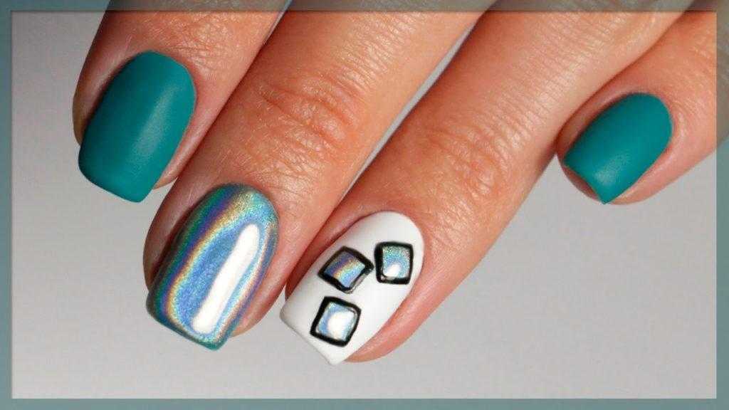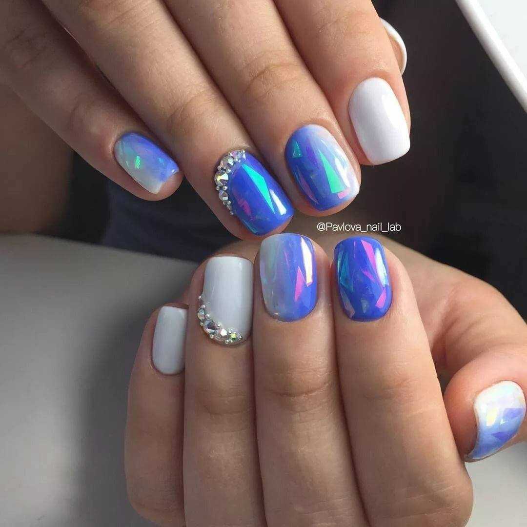 Дизайн ногтей в 2019 году, как можно судить по фото новинок на короткие ногти, также может содержать элементы из фольги в виде «битого текла», снежинок или елочек.