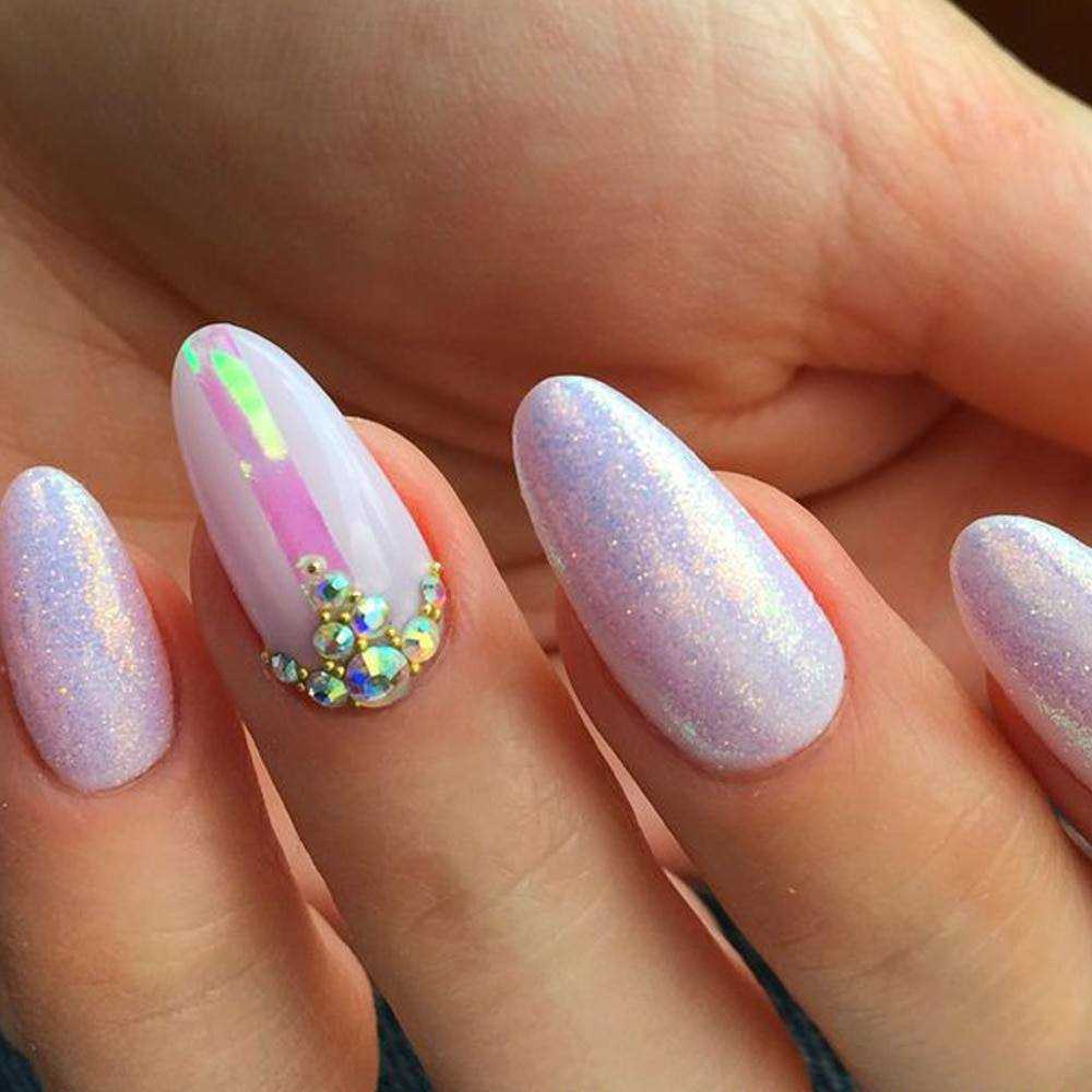 Укрась блестящими кусочками весь ноготь или акцентируй внимание на некоторых пальцах