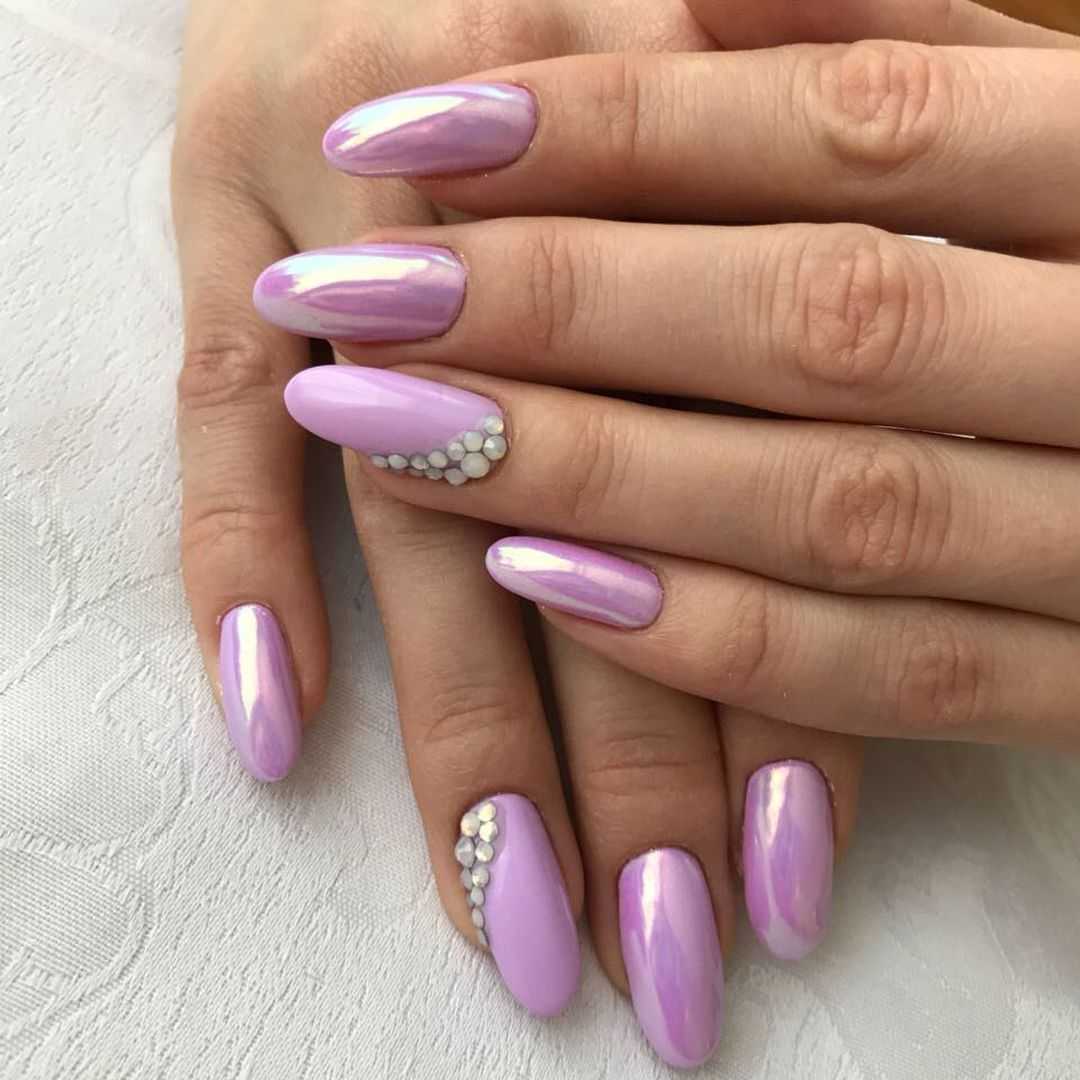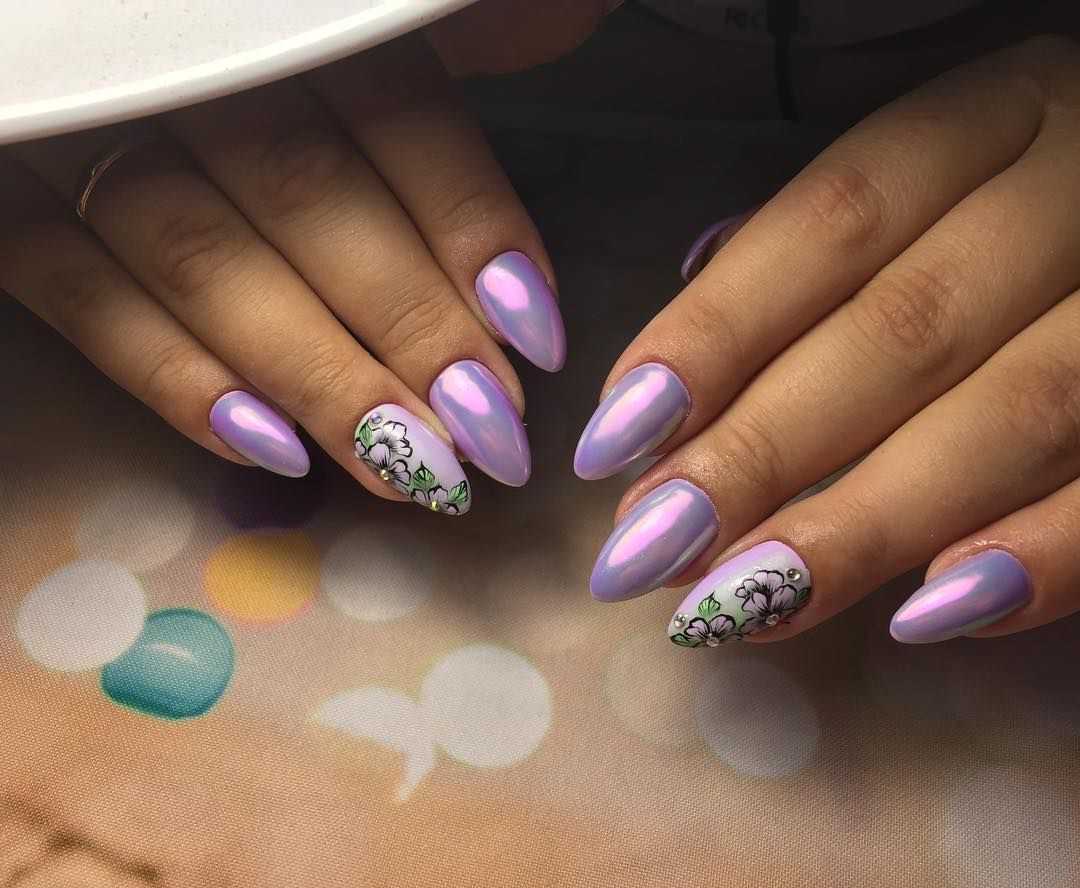 Зеркальный или жемчужный, перламутровый глянец – это верный способ обратить внимание окружающих на свои ухоженные ручки, придать облику уникальный характер, найти собственный, дерзкий стиль. Светлые втирки фиалковых, лавандовых, небесно-ирисовых оттенков очень нарядны, используются на повседневность и для выходов в свет, встреч с друзьями