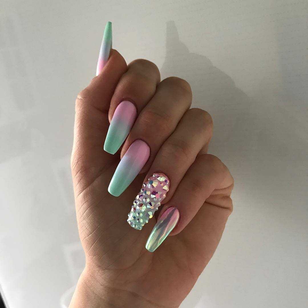 Можно выполнить градиент горизонтально или вертикально. Ярко или приглушённо. Все зависит только от вашей фантазии и настроения. К примеру, для сочного эффекта понадобится ярко-зеленый и голубой. Для более мягкого используйте белый, а соседние ногти покройте одним цветом и матовым топом.