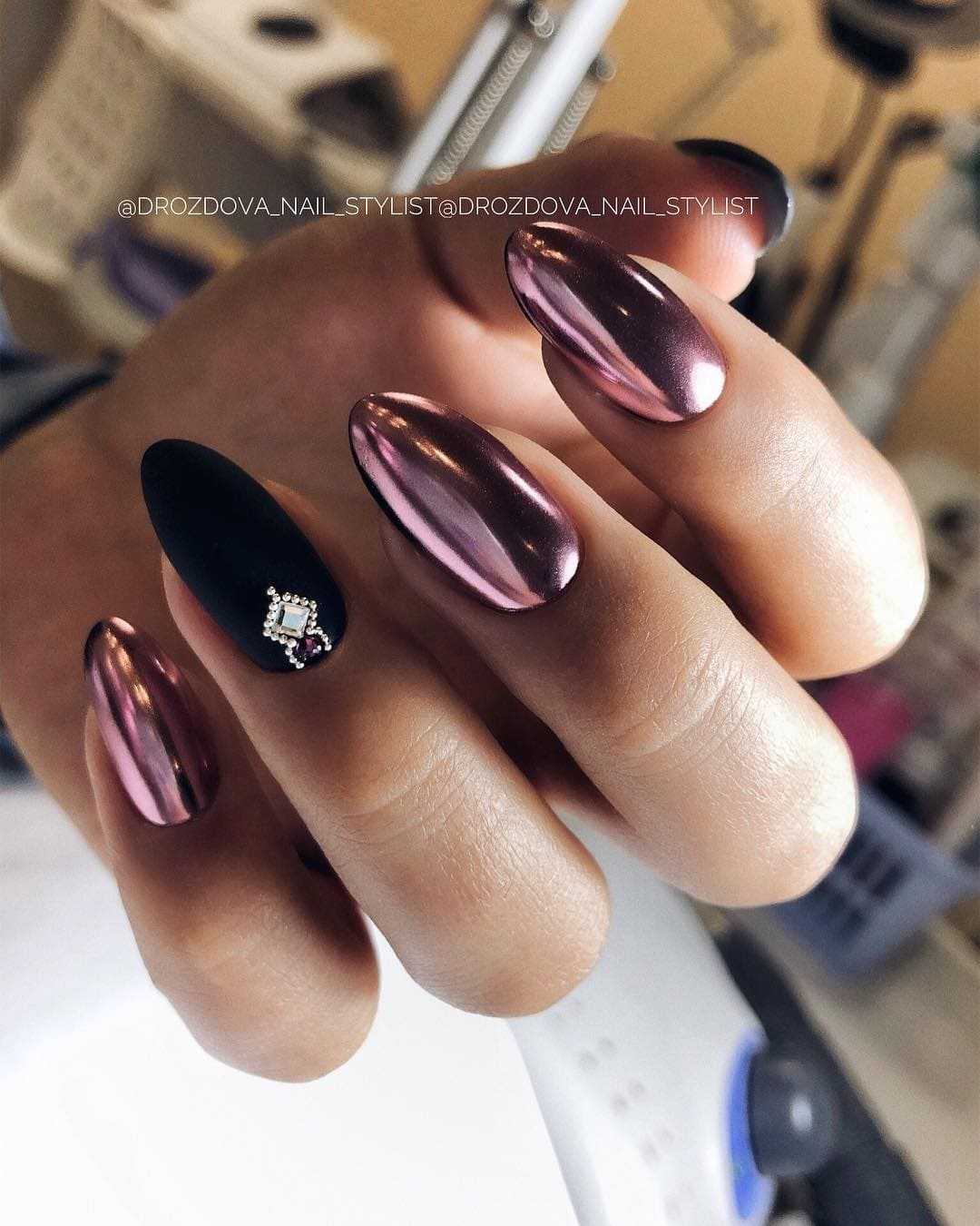 Второй по популярности маникюр с втиркой — зеркальный блеск. Практически все зеркальные втирки наносятся на черный гель-лак для достижения максимального эффекта