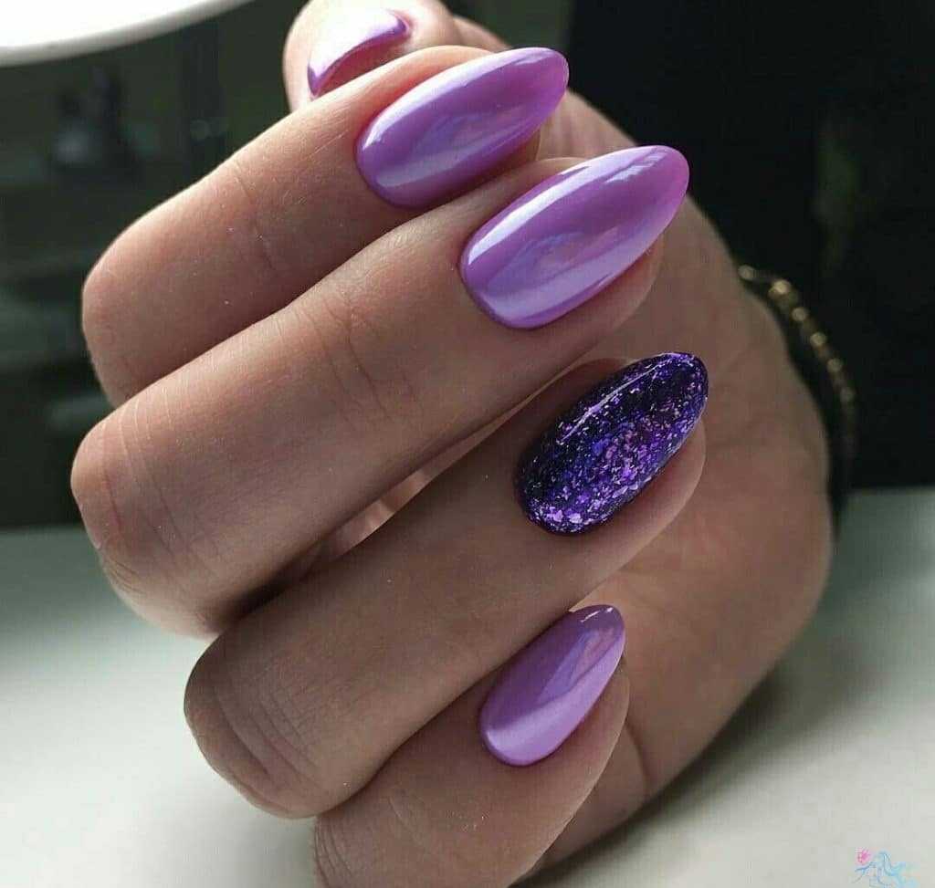Дизайн фиолетовых ноготочков будет выглядеть еще привлекательнее, если дополнить его глиттером. Он может быть того же оттенка, но не менее интересно выглядят серебристые сияющие элементы. Маникюр с глиттером отлично смотрится и на острых длинных, и на коротких ногтях.