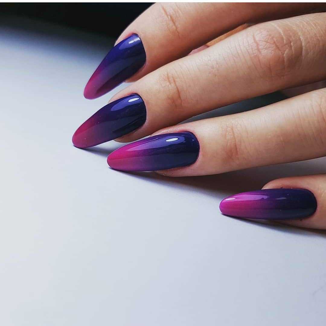 Миндалевидная форма ноготков — классика. Здесь уместны все оттенки сиреневого: от максимально светлых до темных, практически черных. На миндальной форме эффектно смотрится маникюр “кошачий глаз”, вертикальное омбре, необычный френч.