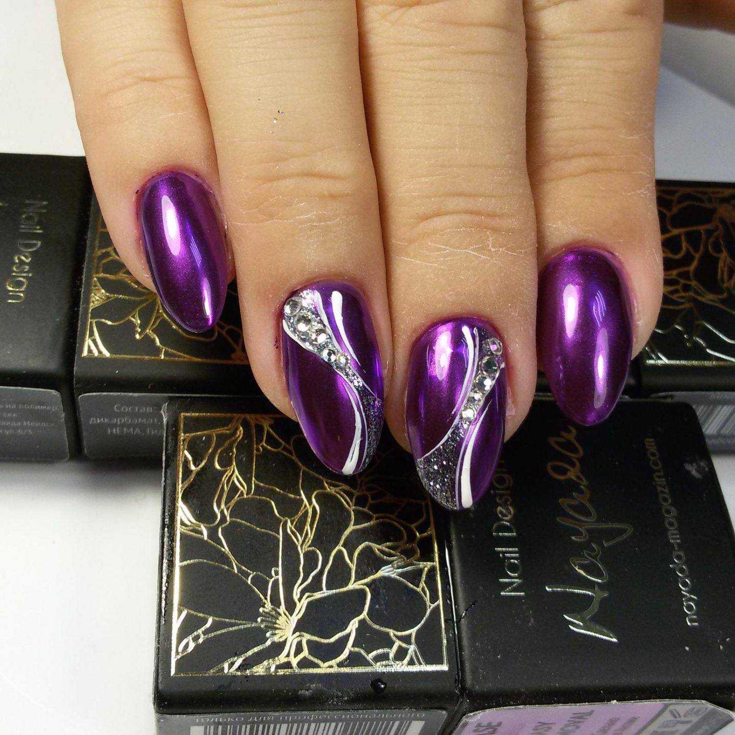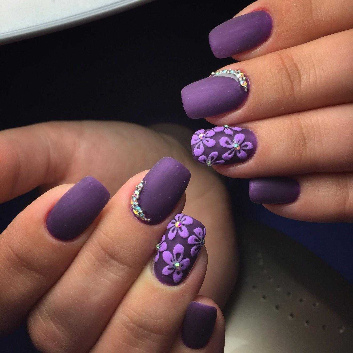 Фиолетовый цвет отлично сочетается с серебряным глиттером, стразами, камнями, бульонками и другим блестящим декором. Особенно нуждается в блеске матовый фиолетовый маникюр, который в однотонном варианте смотрится тускло и банально.