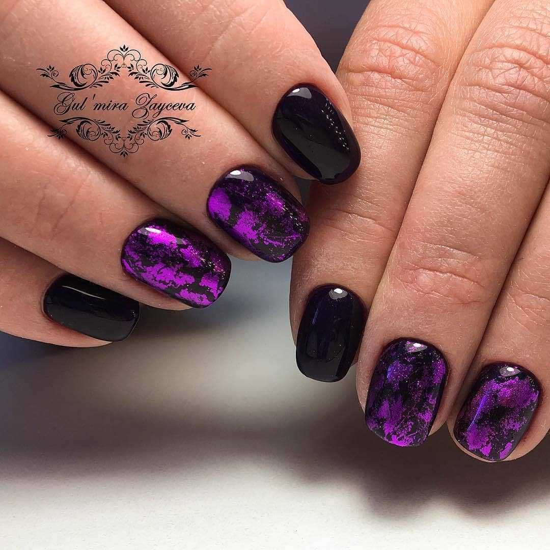 Актуальна черная роспись, омбре с мягким переходом к темному цвету. Черно-фиолетовый маникюр можно освежить с помощью яркой фольги или конфетти. Популярен также френч с черным краем.