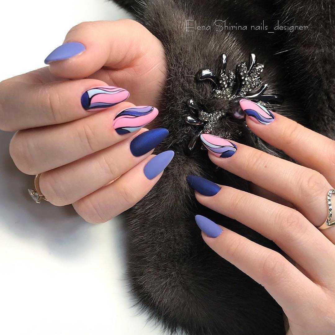 Дизайн маникюра с бархатистым покрытием прекрасно подходит для дополнения любого образа, будь-то важные деловые переговоры, обычная прогулка с друзьями или торжественное мероприятие, где нужно выглядеть на все сто. Матовая структура немного «успокаивает» яркие оттенки и подчёркивает нежность светлых. Поэтому сиреневые ноготки в таком исполнении могут иметь различную насыщенность.