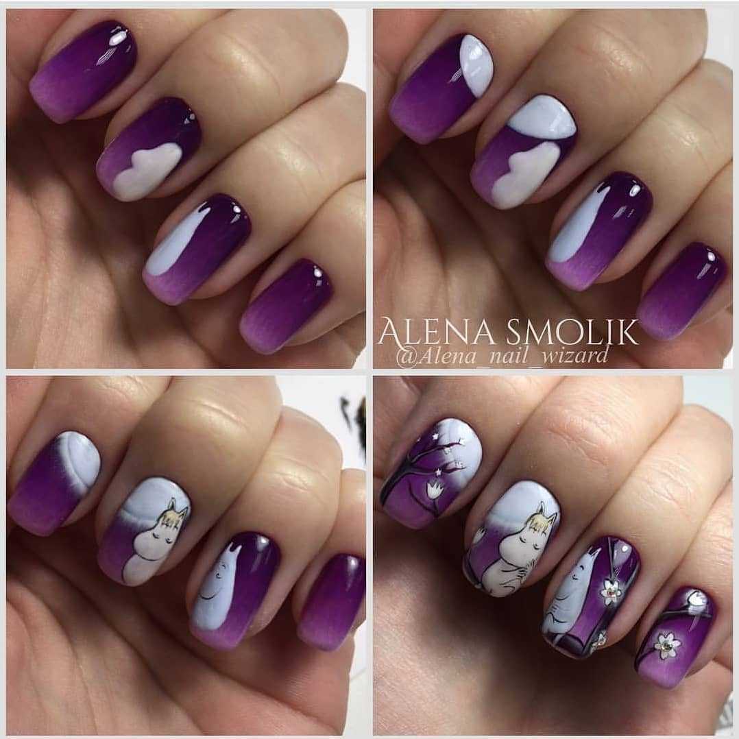 Для фиолетово-белого маникюра подойдут такие сюжеты рисунков как: