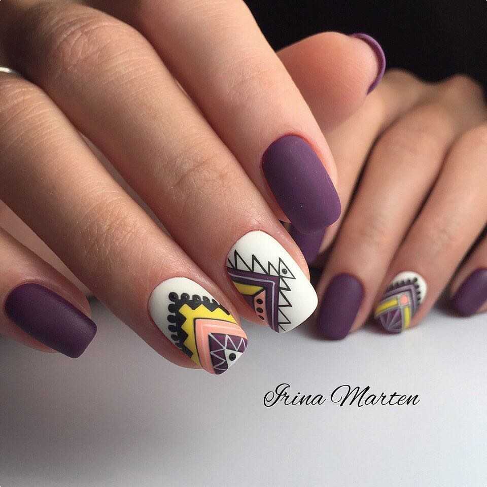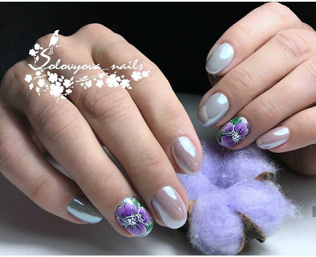 Еще один вариант актуального маникюра. Это одно из самых удачных сочетаний для повседневной носки. Мягкие серые оттенки позволяют полностью раскрыться благородному фиолетовому.